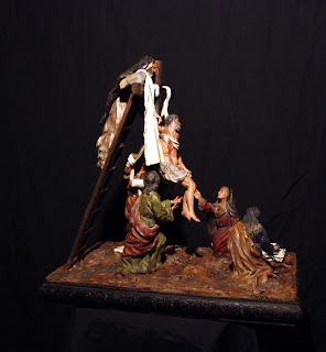 LA ESCENA REPRESENTA AL SEÑOR SIENDO DESCENDIDO POR JOSÉ DE ARIMATEA QUE APARECE VESTIDO COMO SACERDOTE DEL TEMPLO, Y NICODEMO QUE DESDE ABAJO SOSTIENE EL PESO DEL CUERPO DEL SEÑOR CON LA SABANA DESCENDIENDOLO LENTAMENTE. ABAJO LA VIRGEN EXTIENDE LOS BRAZOS CASI ROZANDO LA MANO DE CRISTO MUERTO. SAN JUAN AYUDA A LOS SANTOS VARONES COGIENDO LAS PIERNAS DEL SEÑOR MIENTRAS MARÍA MAGDALENA VA COLOCANDO LOS ELEMENTOS PASIONISTAS A SU LADO JUNTO A LA SÁBANA Y LOS UNGÜENTOS QUE SERVIRÑAN PARA UNGIR EL CUERPO.
