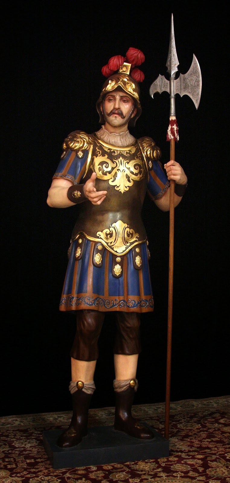 Evidentemente, es una imagen del siglo XXI que se adapta a las formas antiguas.Ha sido realizada de talla completa incluída ropas y plumas,en cedro policromado al oleo y con decoraciones en oro fino.Porta la imagen una alabarda en vez de una lanza, típica del atuendo de los soldados españoles del 1700 que es como se vestían a los romanos que se realizaban para los misterios de la Semana Santa en aquella época.