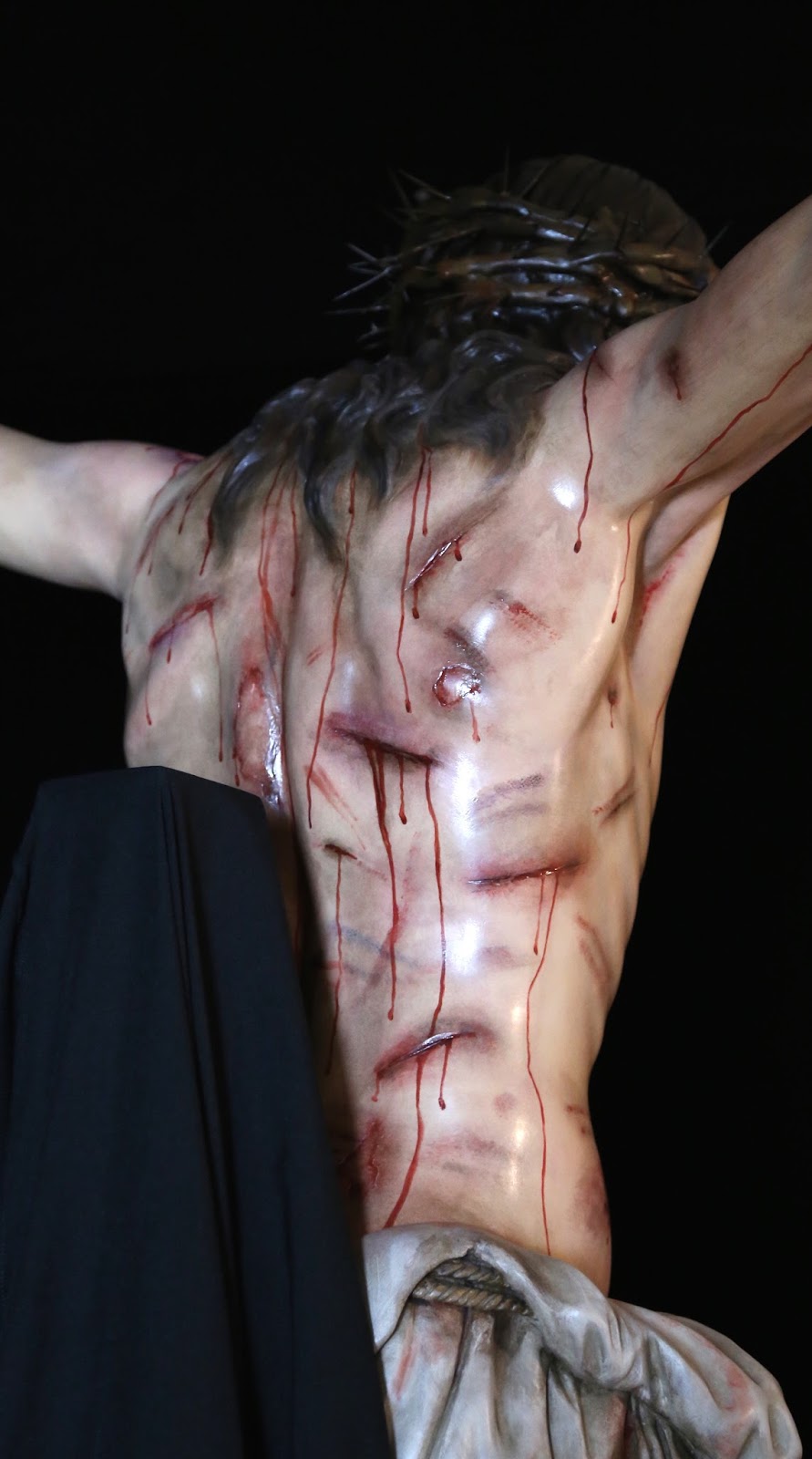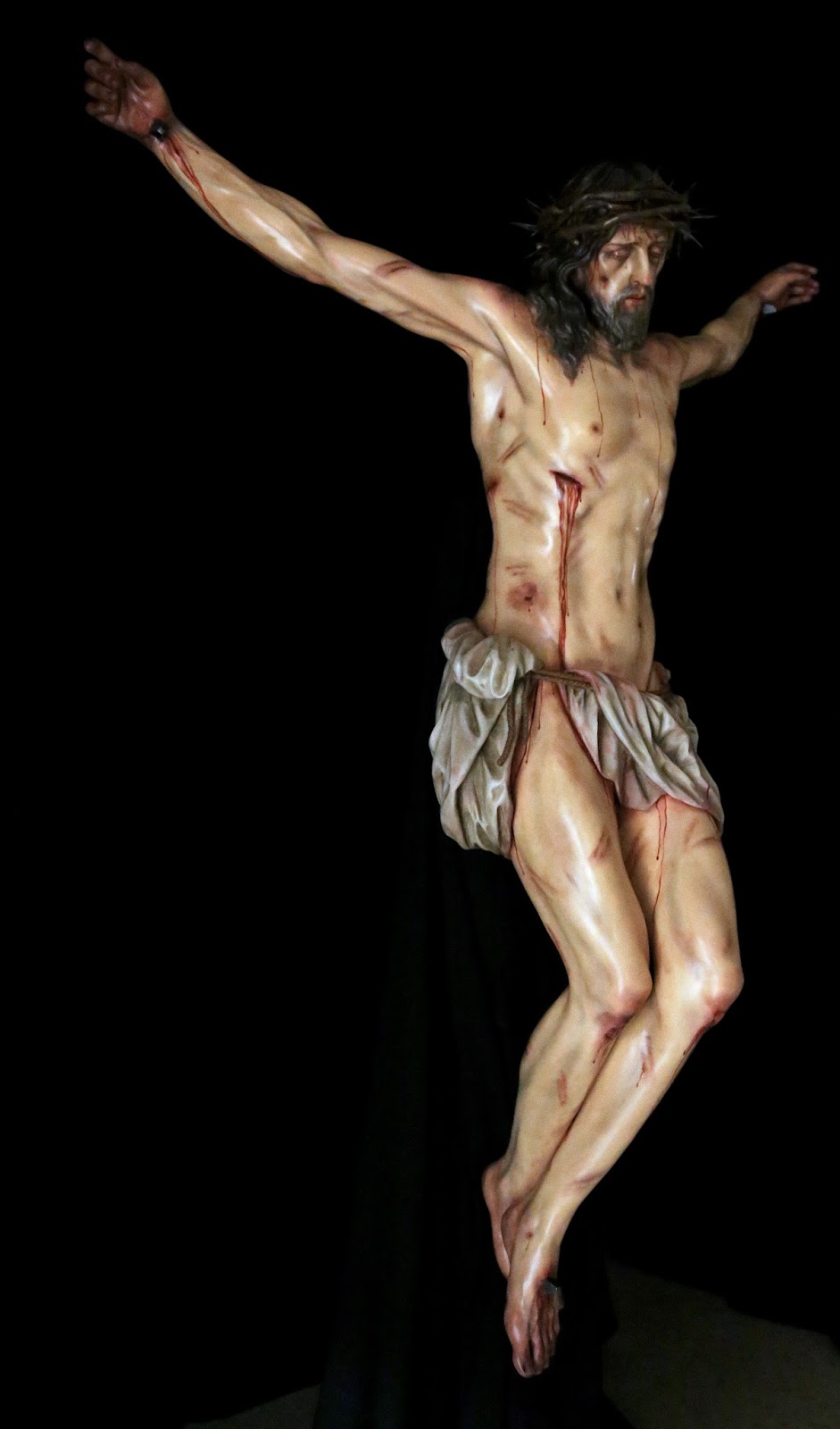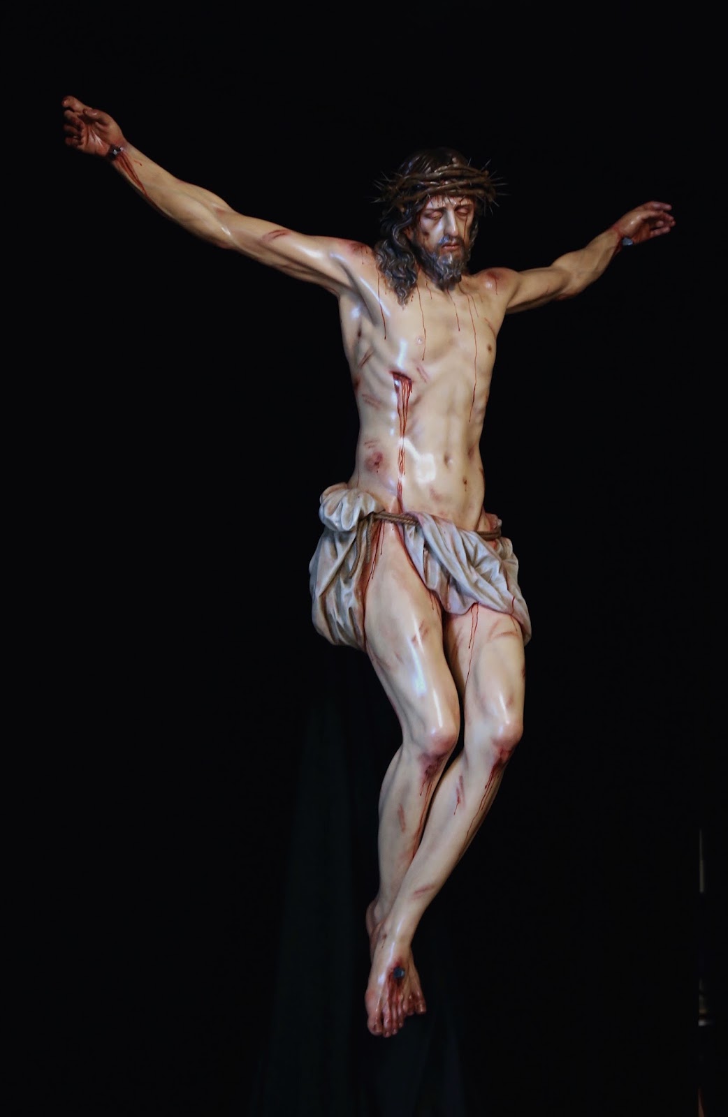 Esta Imagen ha sido una de las que mayores satisfacciones me ha traído puesto que puede realizarla sin prisa ya que la premisa del encargo era esa, disfrutarla y apurarla hasta el final. Como se observa en las fotografías el cuerpo está tallado en directo y sin modelo lo que dificulta muchísimo el proceso de creación. Era toda una aventura con la imagen más compleja de hacer que sin duda es un Crucificado al quedar todo a la vista; pero me gustan los retos y no dudé en hacerlo por el proceso de talla directa. La iconografía responde a Cristo muerto sobre cruz plana con cuatro clavos cruzando el pié izquierdo sobre el derecho y colocando los de los miembros superiores en las muñecas. Aparece con todos los signos de su pasión incluida la lanzada como símbolo máximo de entrega derramando hasta la última gota de su sangre. Es un Cristo redentor que aún sin vida, la intenta transmitir en su mirada entreabierta y su cabeza levantada como queriendo resucitar y abrazarnos. Al ser una Imagen de oratorio quería que conectara de esa manera con los fieles buscando el recogimiento y el cruce de miradas con la suya.Una Imagen con la que identificarse y que invite a la oración. Realizada en madera de cedro policromada al óleo, fue finalizada en Junio de 2015.