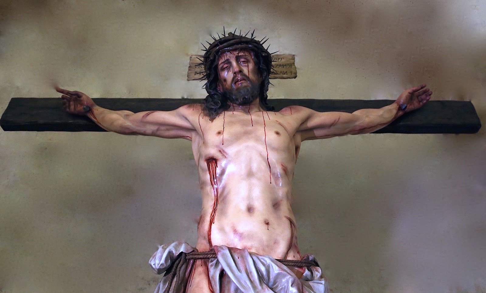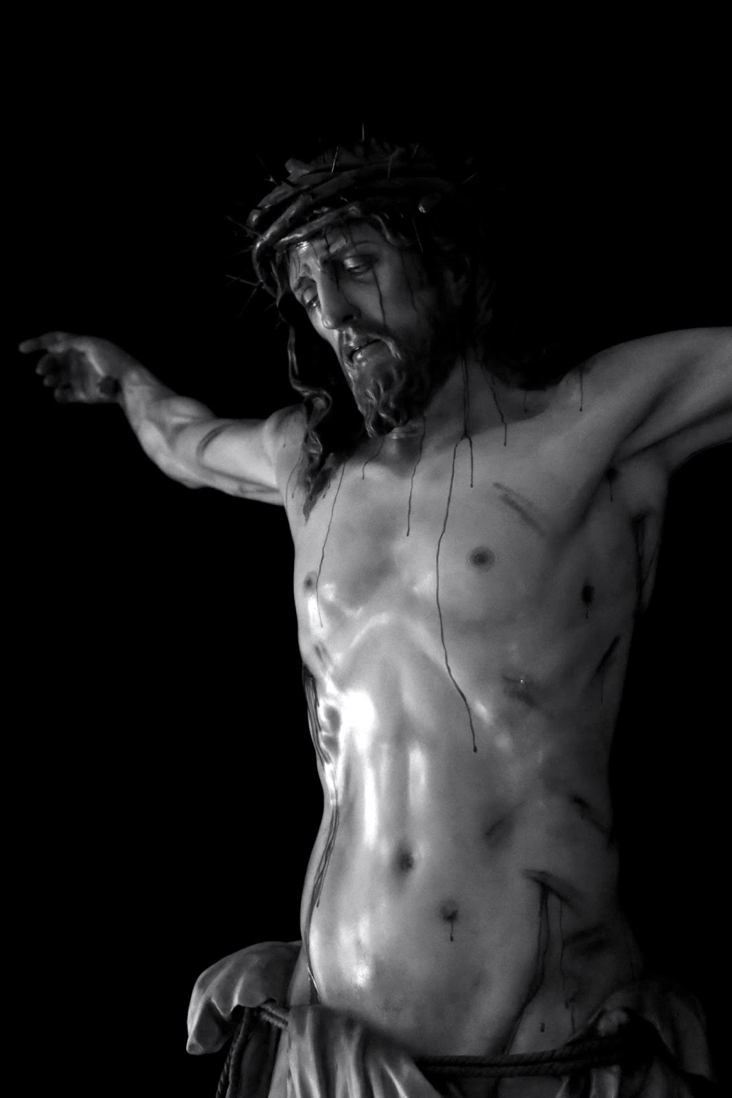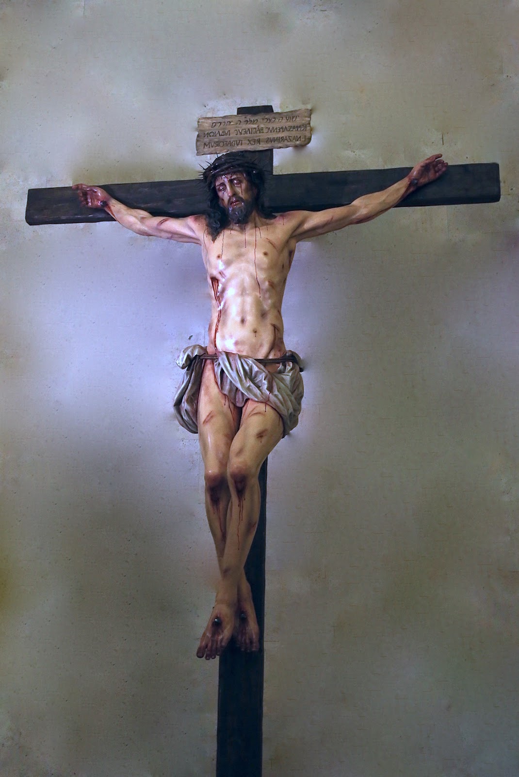 Esta Imagen ha sido una de las que mayores satisfacciones me ha traído puesto que puede realizarla sin prisa ya que la premisa del encargo era esa, disfrutarla y apurarla hasta el final. Como se observa en las fotografías el cuerpo está tallado en directo y sin modelo lo que dificulta muchísimo el proceso de creación. Era toda una aventura con la imagen más compleja de hacer que sin duda es un Crucificado al quedar todo a la vista; pero me gustan los retos y no dudé en hacerlo por el proceso de talla directa. La iconografía responde a Cristo muerto sobre cruz plana con cuatro clavos cruzando el pié izquierdo sobre el derecho y colocando los de los miembros superiores en las muñecas. Aparece con todos los signos de su pasión incluida la lanzada como símbolo máximo de entrega derramando hasta la última gota de su sangre. Es un Cristo redentor que aún sin vida, la intenta transmitir en su mirada entreabierta y su cabeza levantada como queriendo resucitar y abrazarnos. Al ser una Imagen de oratorio quería que conectara de esa manera con los fieles buscando el recogimiento y el cruce de miradas con la suya.Una Imagen con la que identificarse y que invite a la oración. Realizada en madera de cedro policromada al óleo, fue finalizada en Junio de 2015.