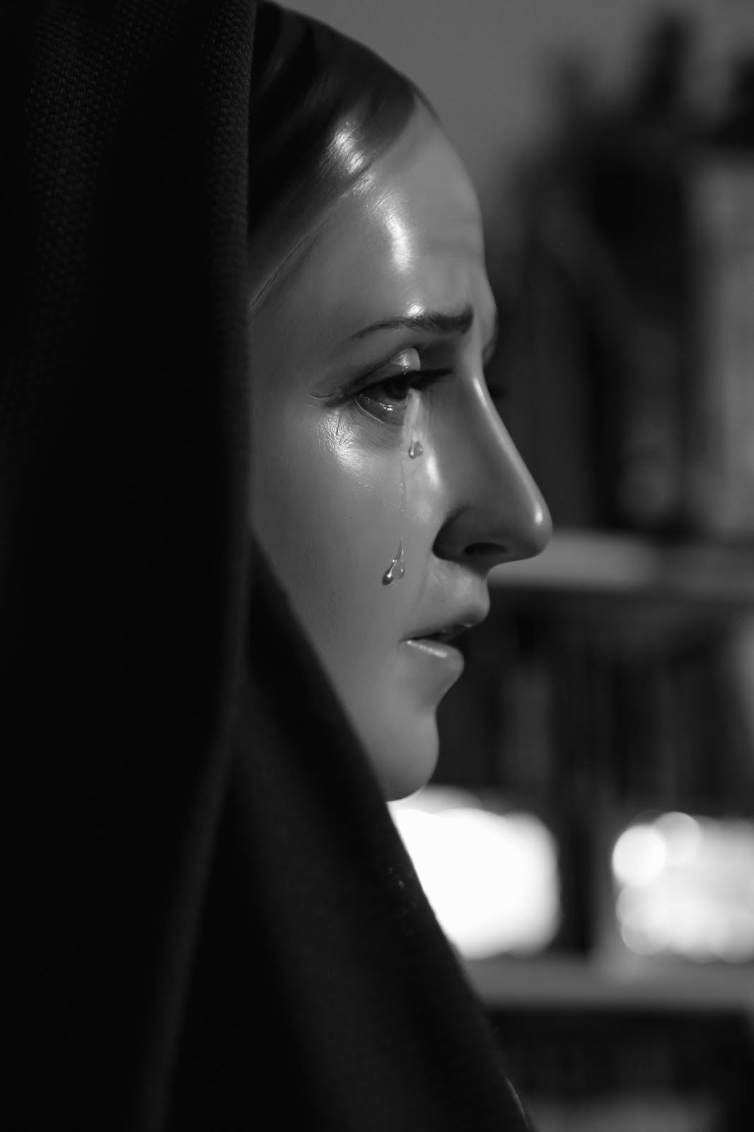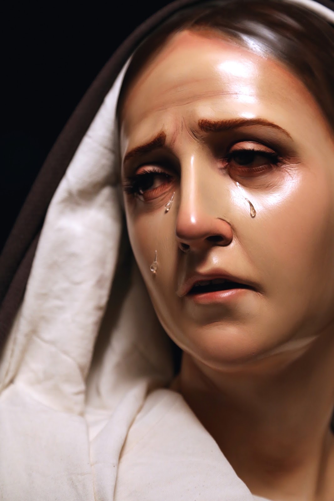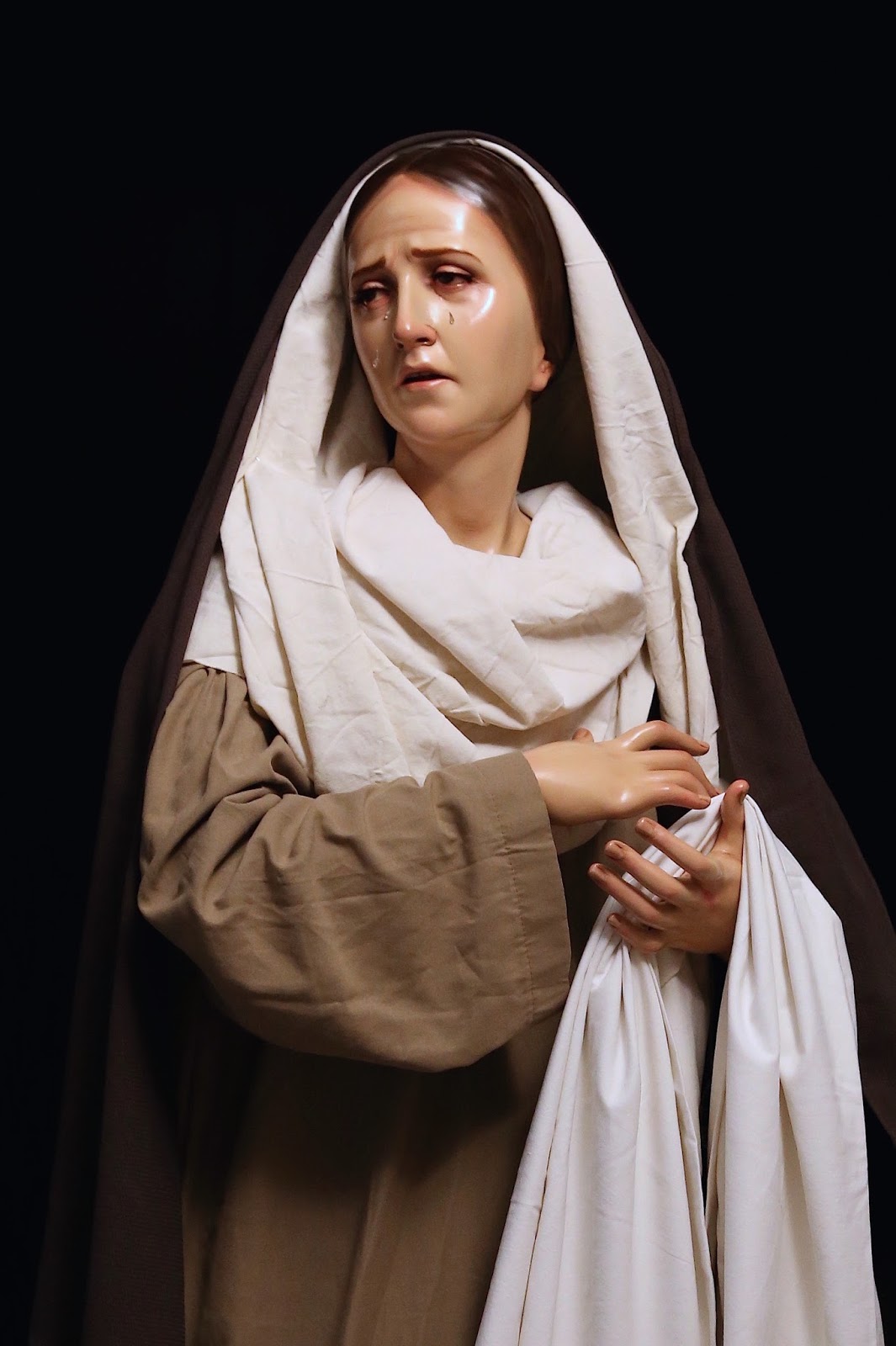 Imagen de candelero y brazos articulados realizada en madera de cedro policromada al óleo, siguiendo la la línea naturalista de mis obras. Representa a esta Santa mujer mirando llorosa y triste a Longinos(imagen por realizar)sosteniendo en sus manos uno de los sudarios con que fue descendido el cuerpo del Señor de la cruz. Ella y la futura imagen cierran el misterio en la trasera del paso en ese diálogo mudo en que María Cleofás se apiada del arrepentimiento del Centurión.