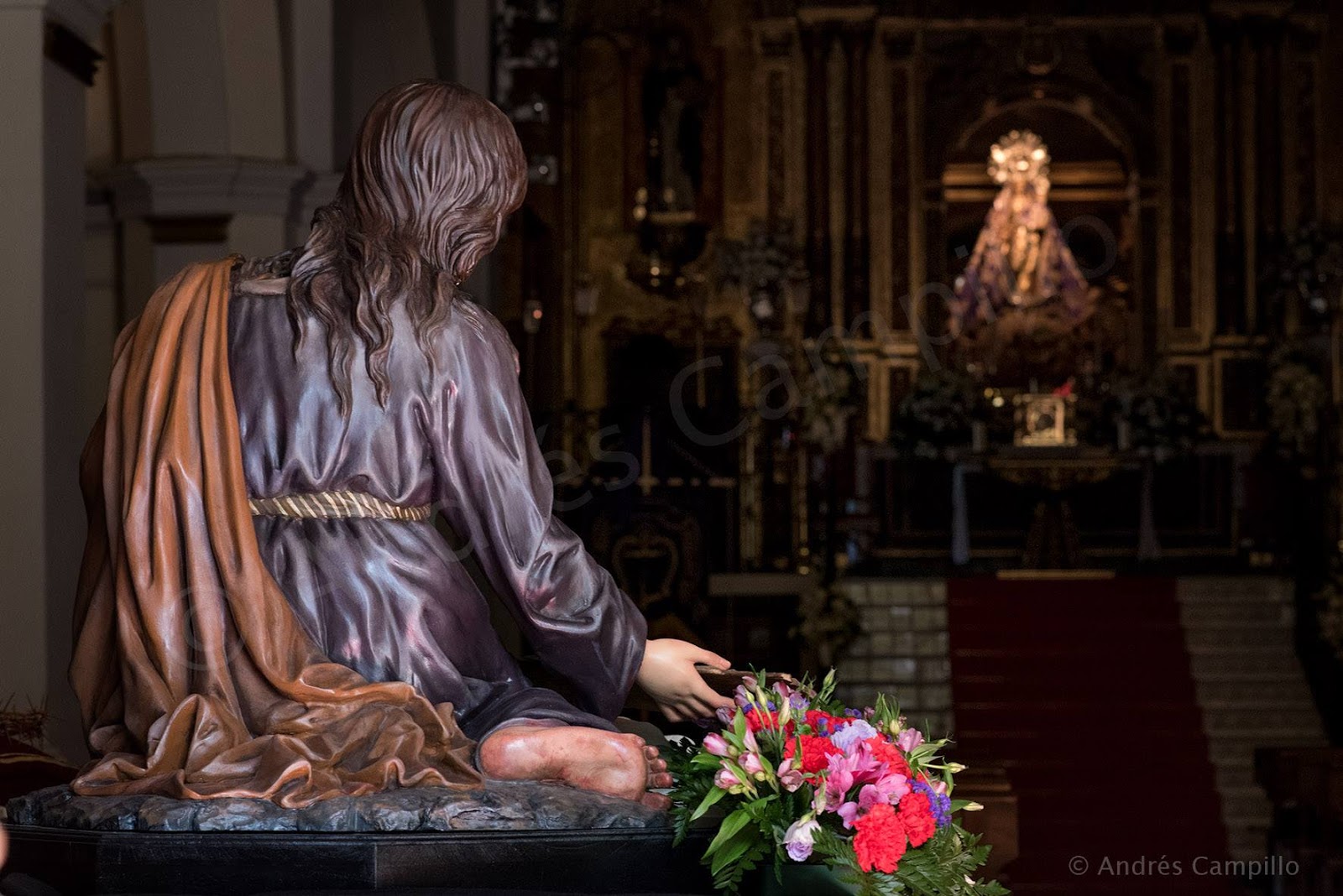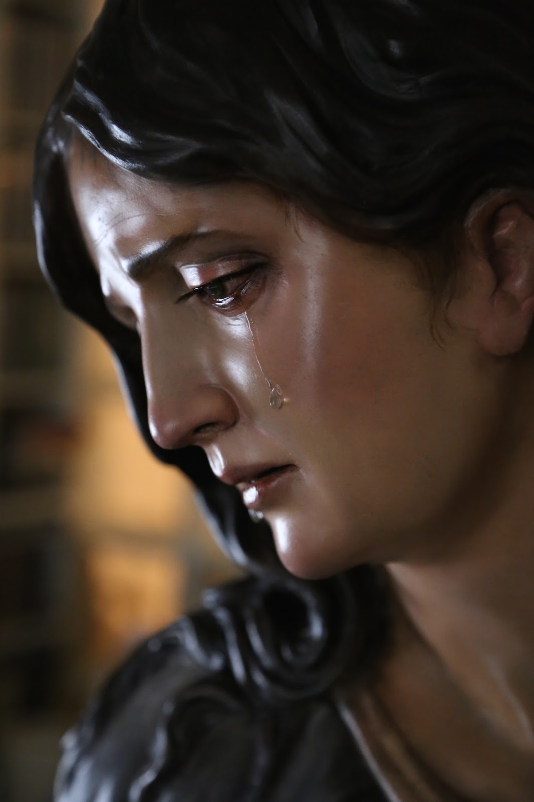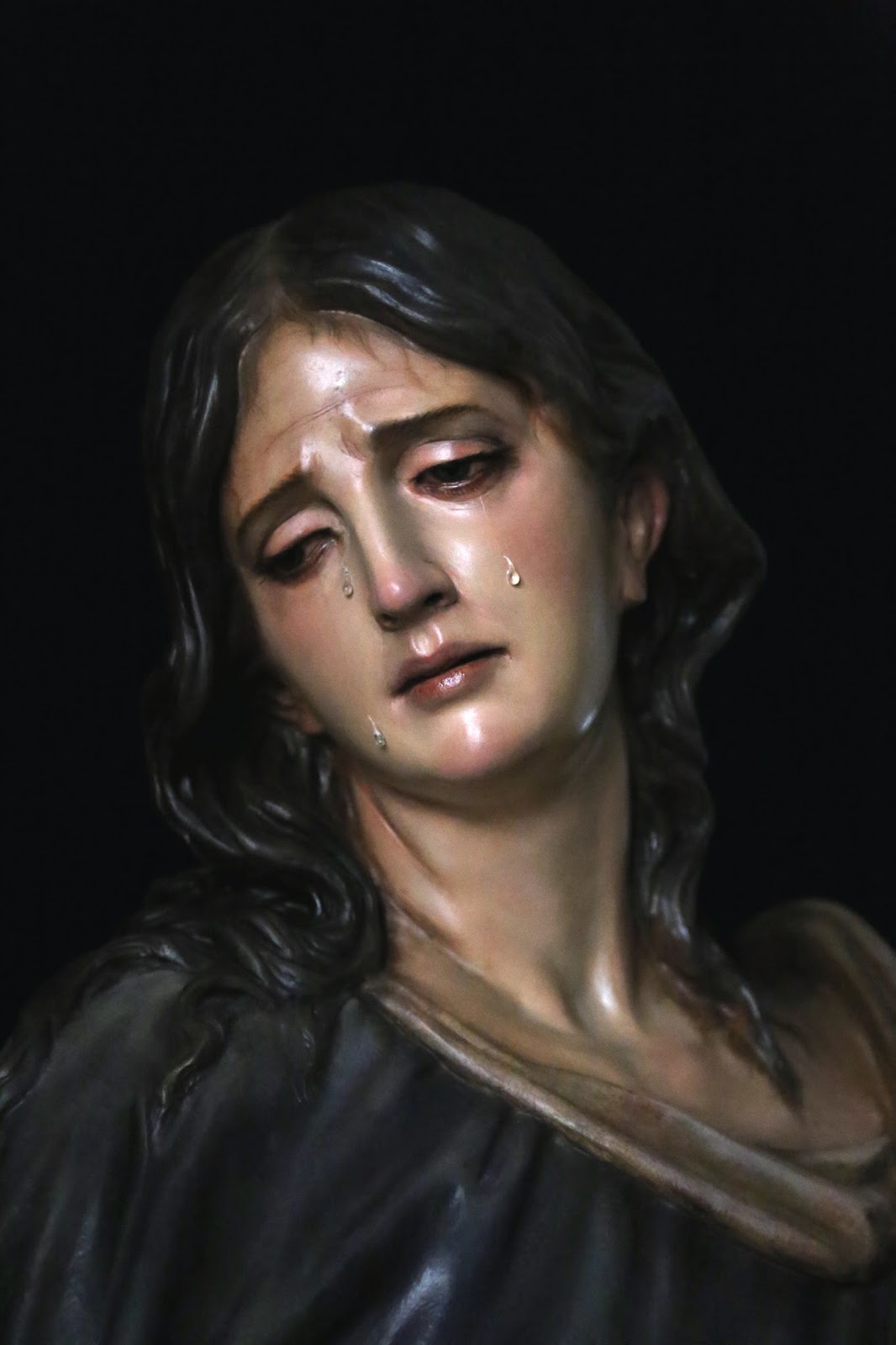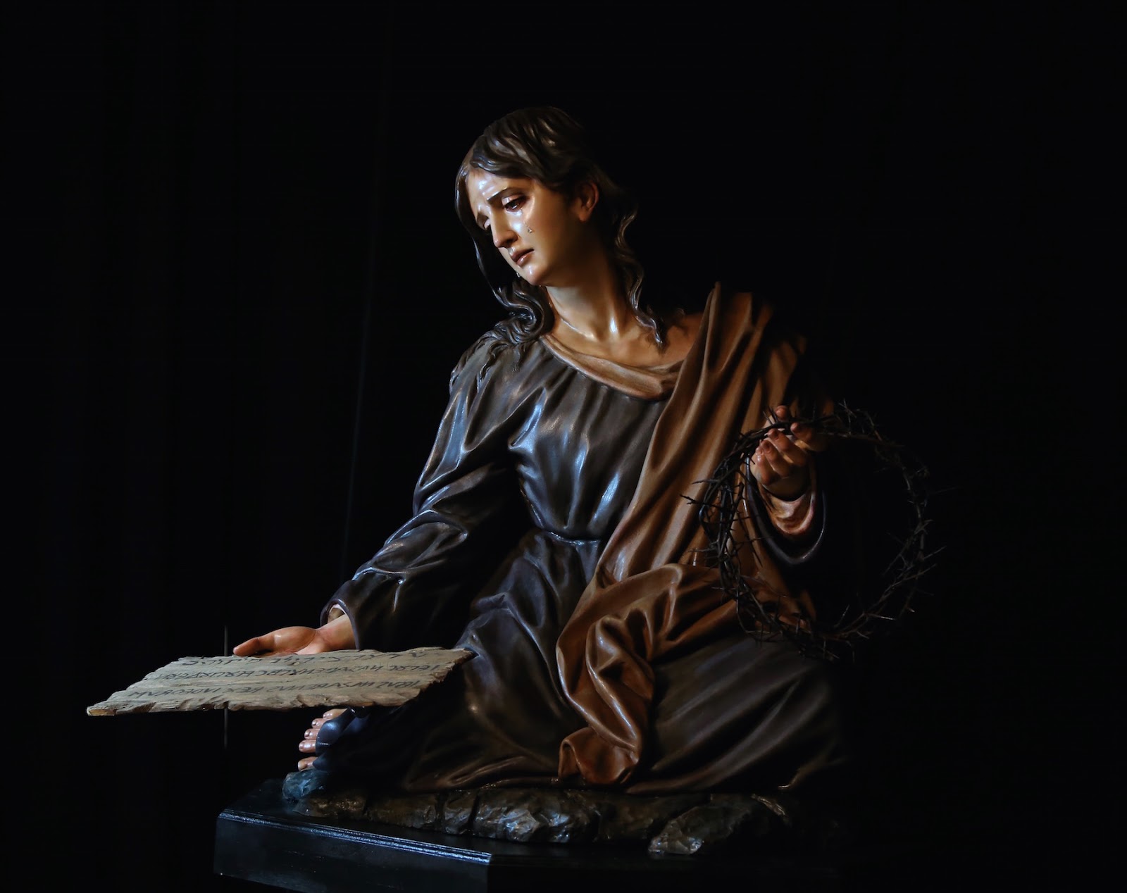 Primera de las imágenes secundarías femeninas para mi conjunto escultórico, realizada como el resto en talla completa en madera de cedro y policromada el óleo. Es una obra con una connotación muy especial que funciona tanto en soledad como obra independiente, y dentro del grupo para el que ha sido concebida. Porta los atributos de la Pasión como son el Títulus y la Corona de Espinas mostrándolos al pueblo sumida en una gran pena contenida que a su vez derrama el llanto sereno, lo que le confiere entidad propia para ser contemplada en ambas situaciones. La imagen ha sido estudiada del natural con modelo vivo para conseguir la naturalidad de la pose y las telas, no siendo retrato de nadie como es el caso del resto de imágenes del misterio, que son todas idealizadas dentro de mi canon naturalista.
