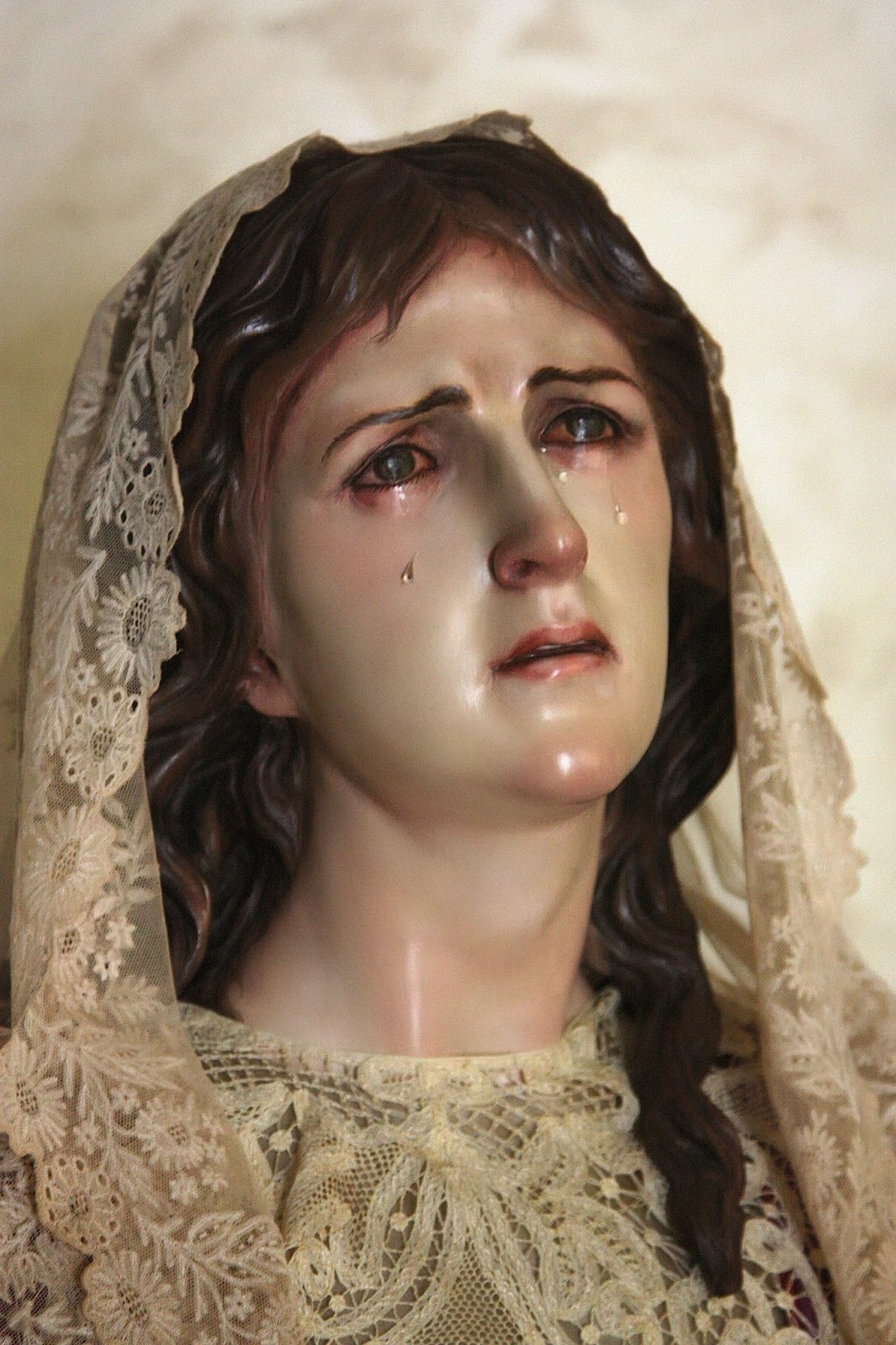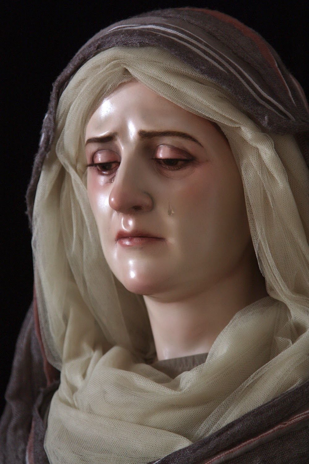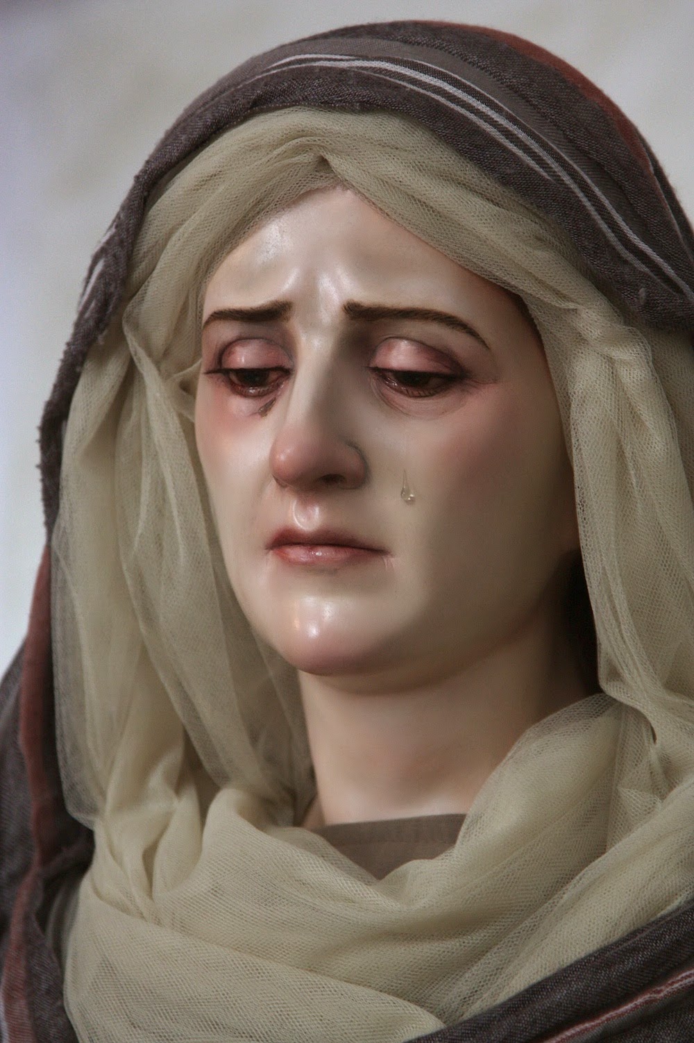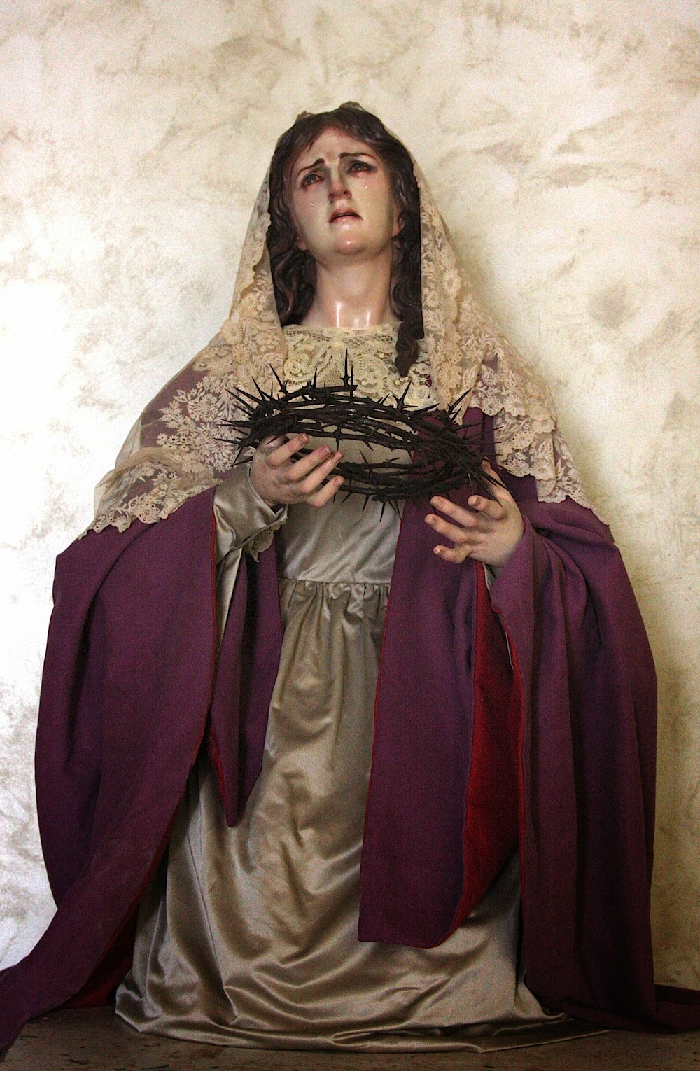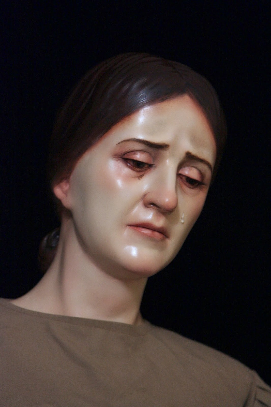 Se trata de las dos primeras imágenes femeninas realizadas en 2012 y 2013 para el conjunto escultórico del traslado al sepulcro. Ambas, completamente diferentes, se desmarcan de la imagen idealizada que busca la belleza en sí, imprimiendo carácter doloroso a ambas, cada una en su expresión. María Magdalena, de larga caballera, contempla arrodillada el rostro del Señor y con su mano intenta sostener el brazo muerto de Cristo antes de que se desplome. María Salomé sostiene la sábana junto a los pies agachando el rostro embargado de tristeza. Para esta última me he servido de los rasgos faciales de mi madre,quién me ha posado para ofrecer mayor naturalidad a la imagen pero sin llevar el retrato a la exactitud. Están realizadas a tamaño natural de candelero y articuladas en los brazos, talladas en madera de cedro y policromadas al óleo.