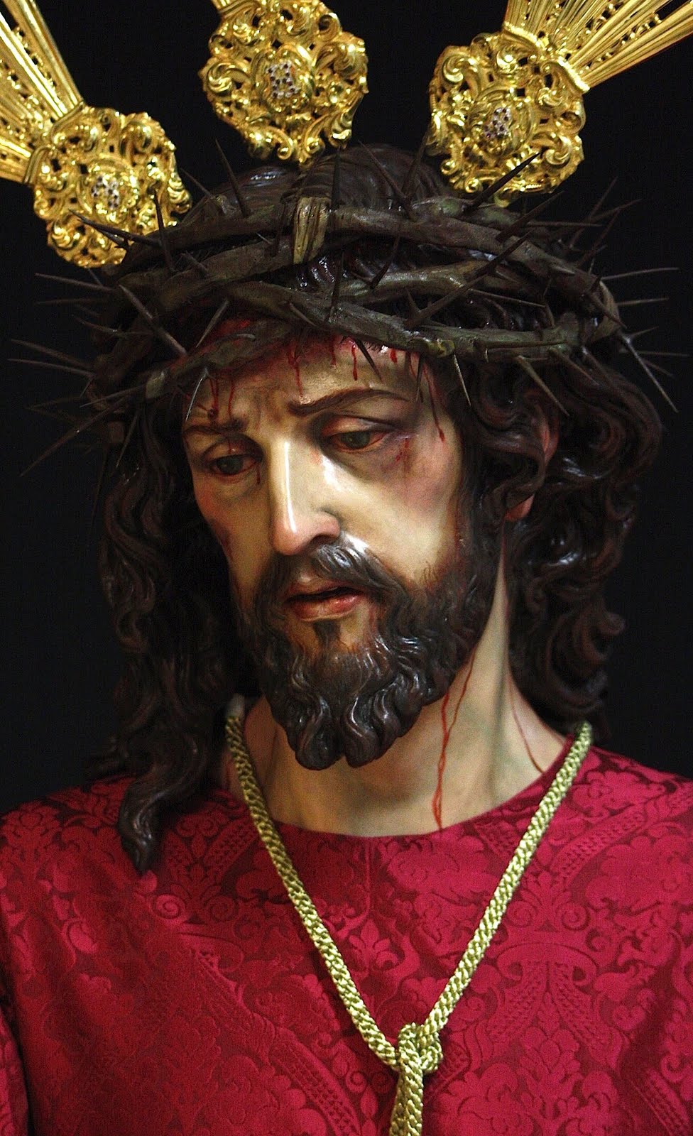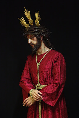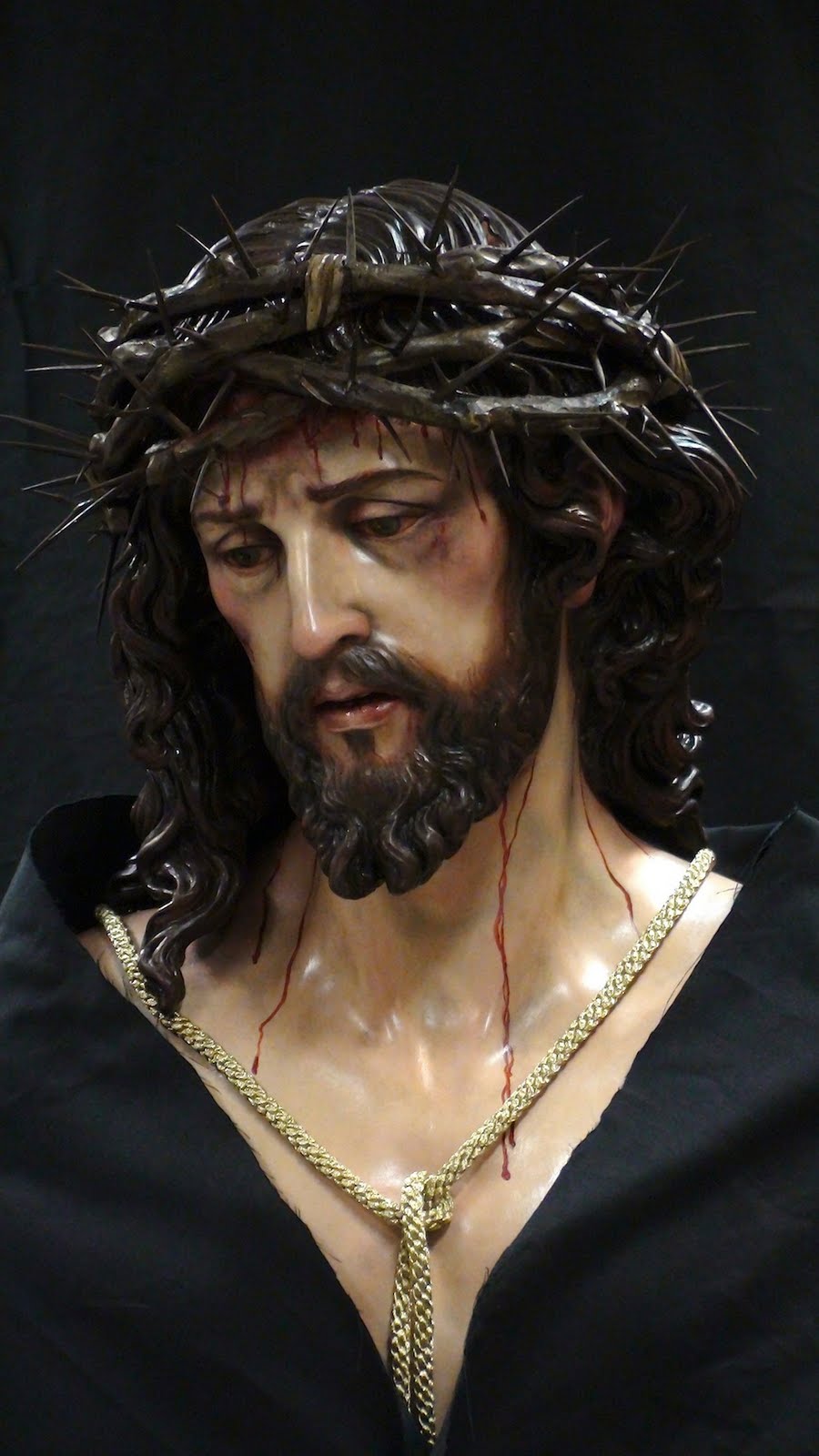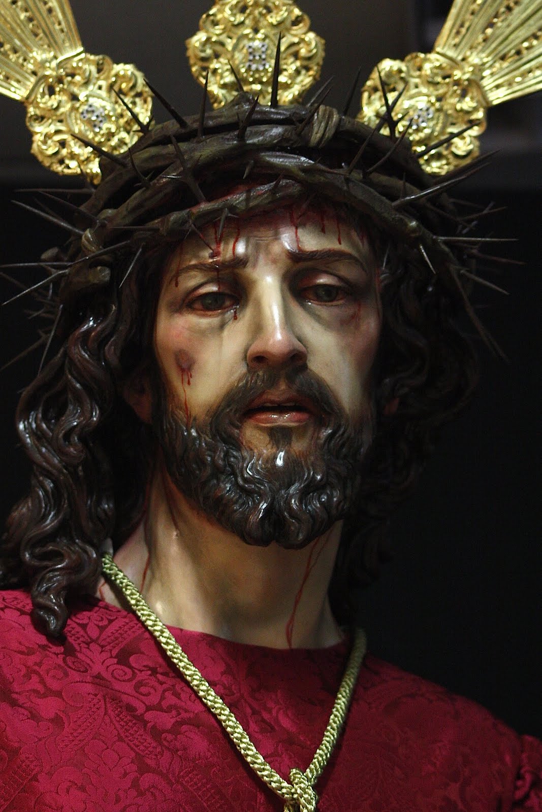 ESTA ES MI ÚLTIMA OBRA . EL SEÑOR DEL AMOR, EL QUE A PARTIR DE AHORA ES EL SEÑOR DEL BARRIO DE FUENTEAMARGA EN CHICLANA. UNA IMAGEN QUE REPRESENTA A CRISTO EN EL MOMENTO DE SER SENTENCIADO A MUERTE. DE AHÍ SU ROSTRO PENSATIVO, TRISTE PERO SERENO, ASUMIENDO LA DURA CARGA DE MORIR POR AMOR AL HOMBRE. LA SANGRE FRESCA, EL SUDOR DE LA FRENTE Y EL CABELLO AGUDIZAN EL MOMENTO. SU CUERPO SE PRESENTA EN CONTRAPOSTO SOBRE LA CADERA IZQUIERDA, Y CON UNA LEVA ZANCADA AVANZANDO LA PIERNA IZQUIERDA EN ACTITUD DE CAMINAR SIMBÓLICAMENTE HACIA LA CRUZ DE SU MARTIRIO QUE YA LO ESPERA. LA OBRA ESTÁ COMPLETAMENTE ANATOMIZADA SALVO LOS BRAZOS QUE SON ARTICULADOS. LA CORONA DE ESPINAS ESTÁ TALLADA SOBRE LA PROPIA CABEZA. LUCE POTENCIAS DE ORFEBRERÍA ANDALUZA.