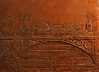 Relieve en terracota patinada de 30 x 40 cm sobre la vega del río Guadalquivir por el Puente de Isabel II, popularmente conocido como el de Triana, visto desde la O. No busco la perfección del detalle, sino la impronta del paisaje y la luz de los planos y su perspectiva.