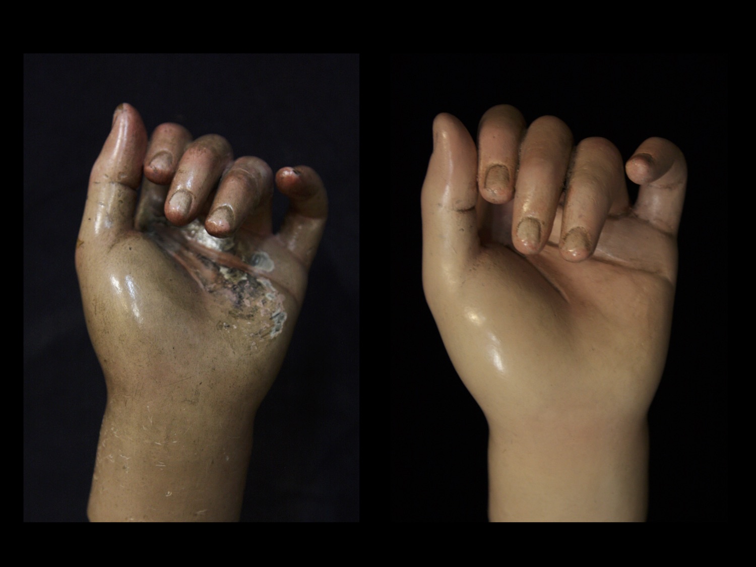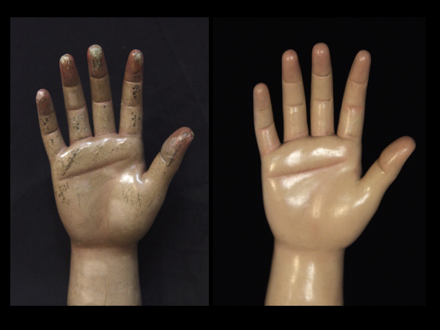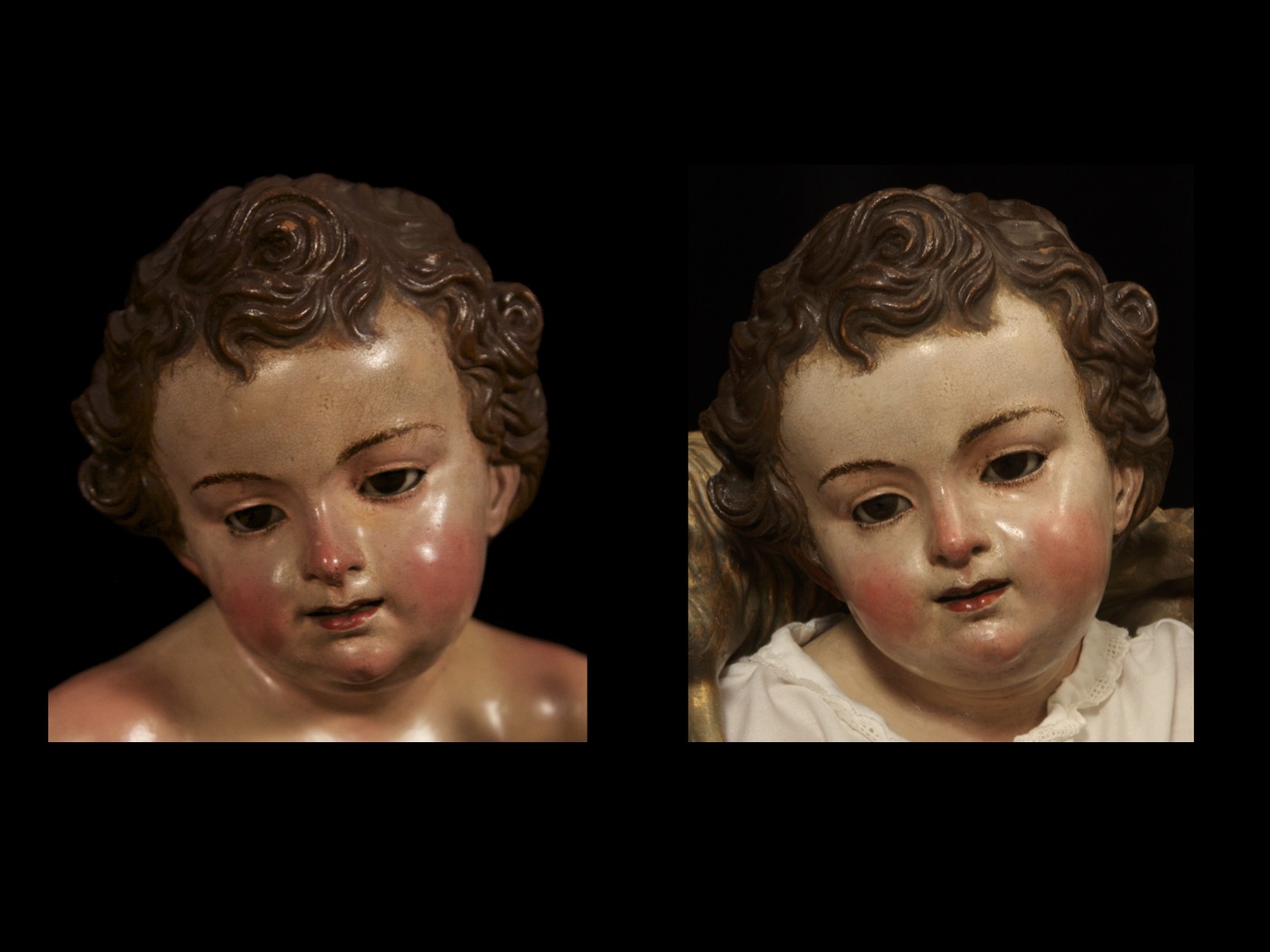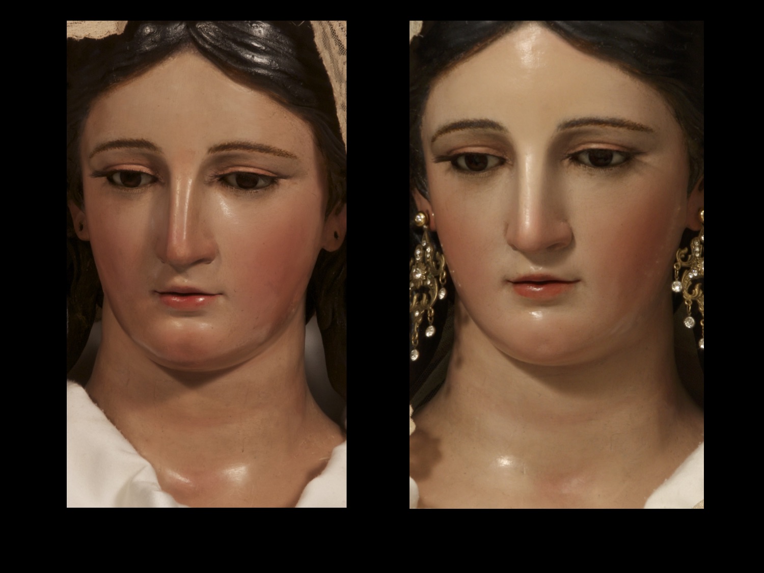 El tratamiento de las tres imágenes ha sido consolidar los ensambles y las fisuras devolviendo la estabilidad a los soportes, realizando una nueva peana para el Pastorcito asegurando su sujeción y consolidando el risco de la Stma. Virgen. Se han limpiado y reintegrado las policromías, retirando en el caso de la Virgen los repintes del rostro y manos (realizados por Sebastián Santos y Buíza) que estaban alterados sacando a la luz la tonalidad original de sus carnaciones. Se optó por dejar el del cuello al encontrase estable de tonalidad.Se han retirado los cueros pegados a los pies procediendo a su limpieza y posterior reintegración. Se han sustituido los brazos por unos de esfera y se han colocado nuevos sistemas de sujeción de las manos, realizando por último un corpiño de cuero protector.