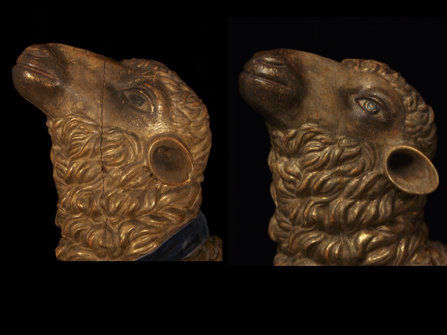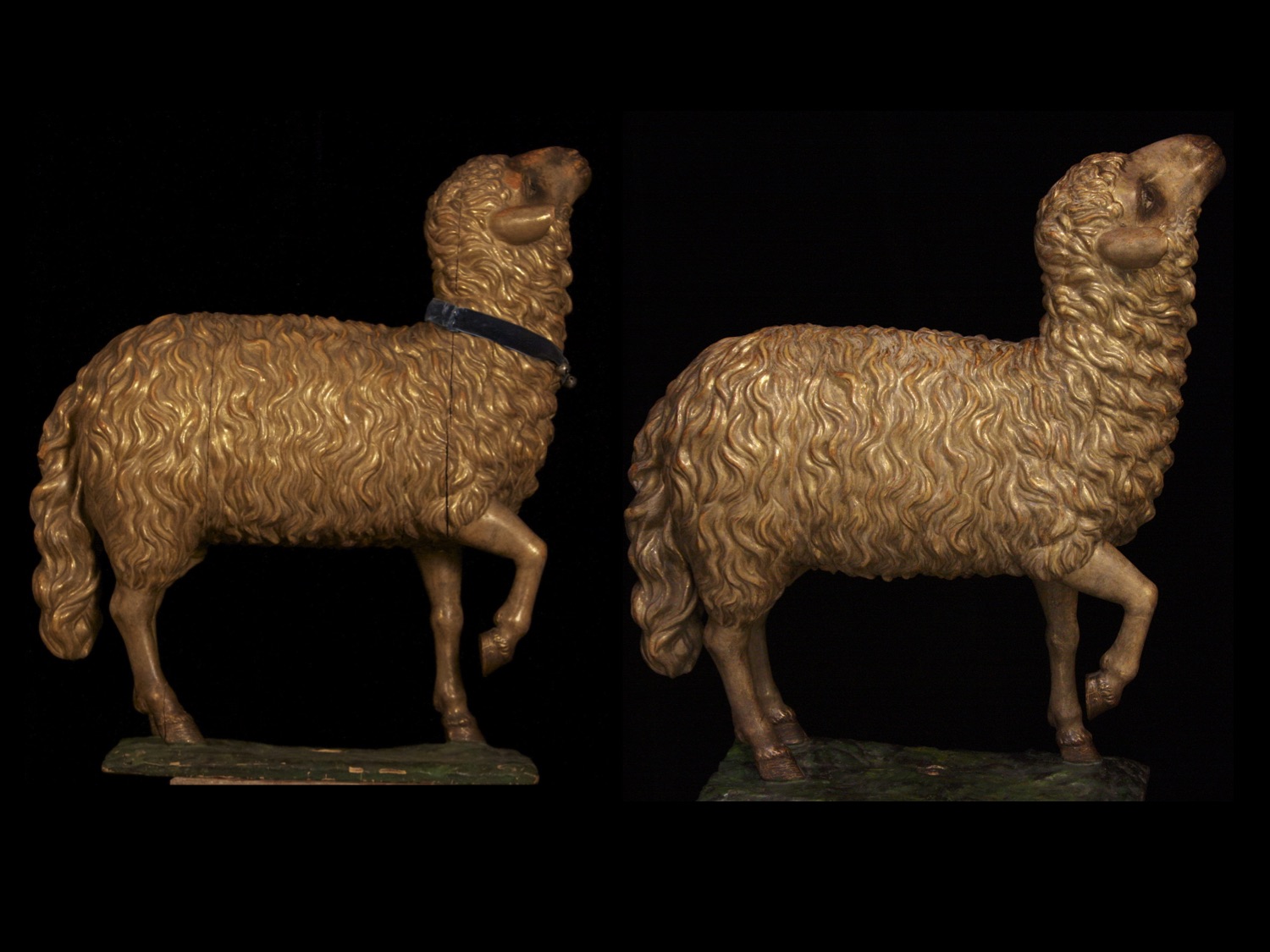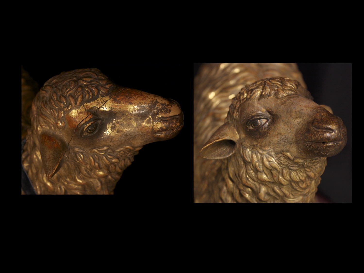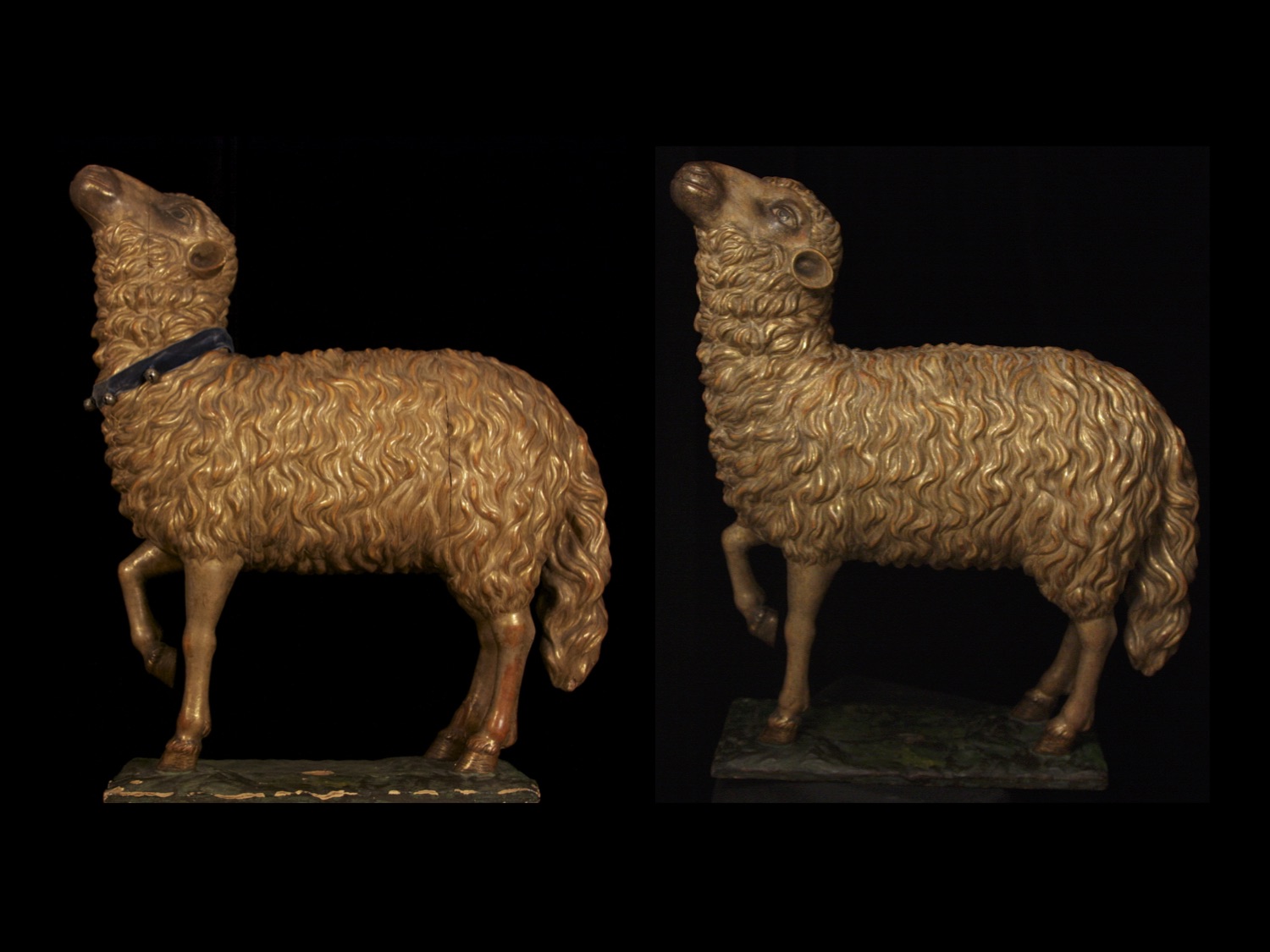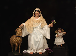 La restauración de estas benditas Imágenes son la igual que el caso del Señor Cautivo de Santa Genoveva, algo muy especial para mí, además de ser toda una responsabilidad por ser una de las Imágenes gloriosas más devocionales de la ciudad, valor añadido al sentimental y al propio artístico, al tratarse de tres obras de una gran valía. La Virgen es obra del profesor gaditano José Guerrero, quien se basa en una Venus para su realización. En 1956 Sebastian Santos le coloca ojos nuevos y toca la policromía, y posteriormente Buíza vuelve a retocarla al hacerle el cuerpo anatomizado en 1982. El Pastorcito es obra en barro cocido de Cristobal Ramos del siglo XVIII y el cordero es obra de Sebastián Santos quién lo regala a la Virgen en agradecimiento por un favor concedido.