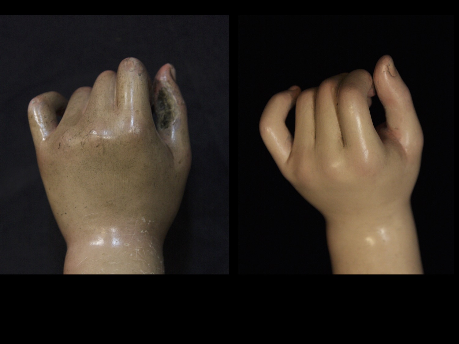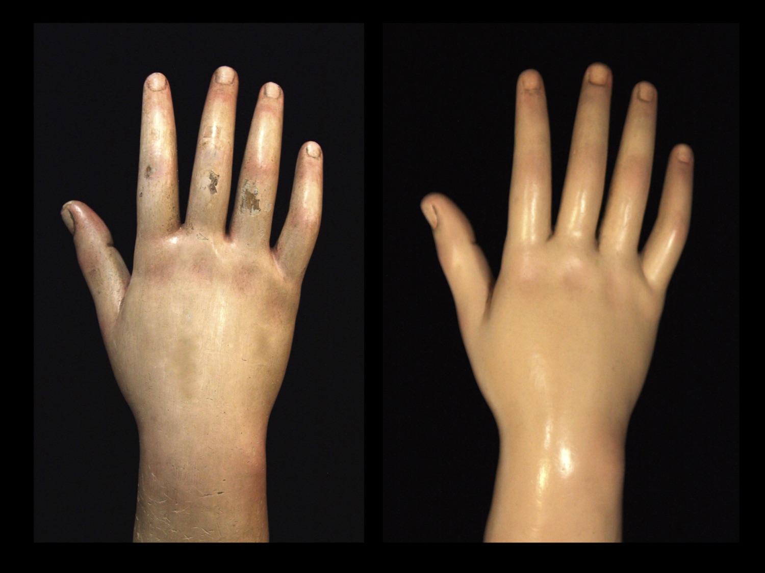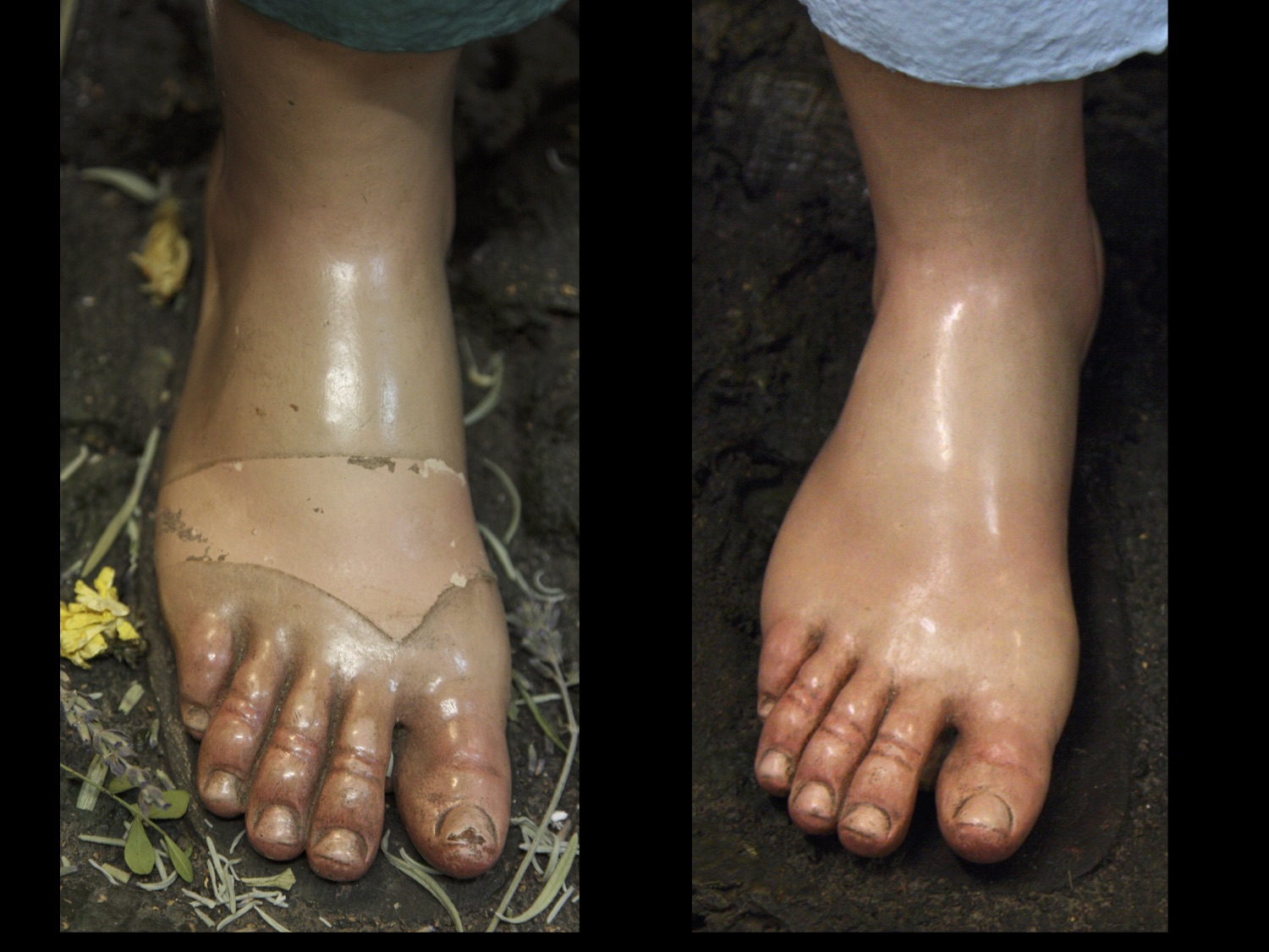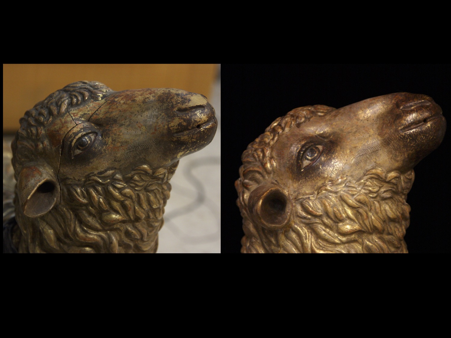 La restauración de estas benditas Imágenes son la igual que el caso del Señor Cautivo de Santa Genoveva, algo muy especial para mí, además de ser toda una responsabilidad por ser una de las Imágenes gloriosas más devocionales de la ciudad, valor añadido al sentimental y al propio artístico, al tratarse de tres obras de una gran valía. La Virgen es obra del profesor gaditano José Guerrero, quien se basa en una Venus para su realización. En 1956 Sebastian Santos le coloca ojos nuevos y toca la policromía, y posteriormente Buíza vuelve a retocarla al hacerle el cuerpo anatomizado en 1982. El Pastorcito es obra en barro cocido de Cristobal Ramos del siglo XVIII y el cordero es obra de Sebastián Santos quién lo regala a la Virgen en agradecimiento por un favor concedido.