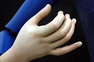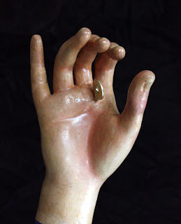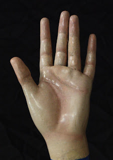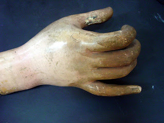 LA MANO DERECHA DE LA STMA VIRGEN SE DESMONTÓ DEDO A DEDO, LOS CUALES ESTABAN FRACTURADOS Y MAL PEGADOS, CUBIERTOS DE PASTAS, ESTUCOS Y CAPAS DE PINTURA FALSAS. SE RECUPERÓ LA POLICROMÑIA ORINAL DE LOS MISMOS REINTEGRANDO ÚNICAMENTE DONDE FALTABA LA CAPA DE COLOR.