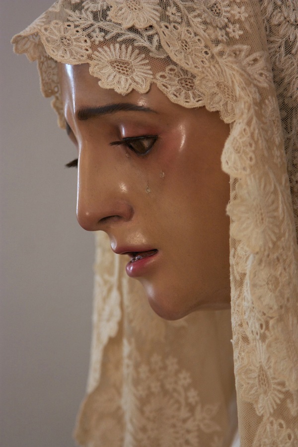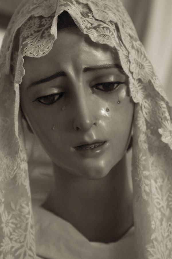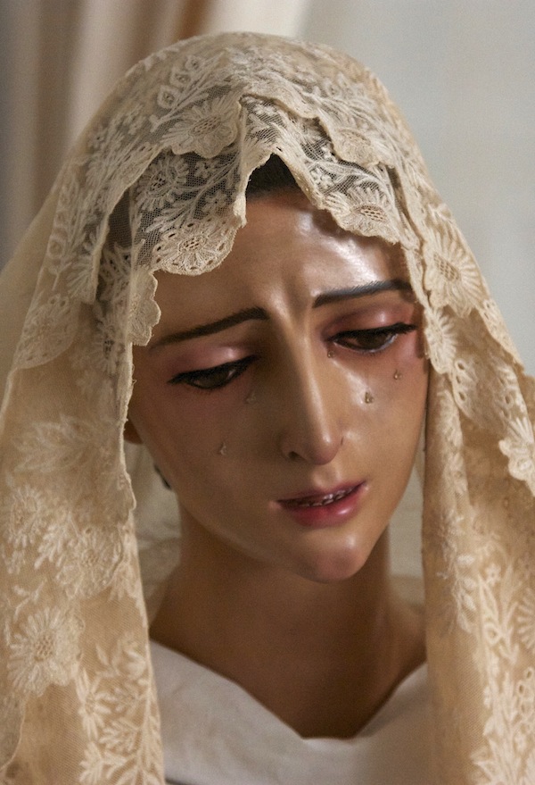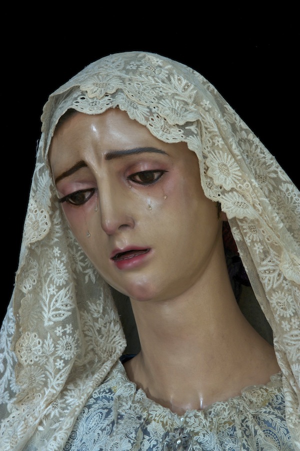 El proceso ha constado de eliminación completa de la pátina oleosa, eliminación de policromía de cejas, ojos y labios que desvirtuaban la suavidad del modelado, restauración de fisuras, pestañas y lágrimas originales y aplicación de una veladura de oleo siguiendo la tonalidad original que la Imagen ahora conserva y que no ha sido retirada.La capa pictórica original, tanto en conservación como en color es correcta, por lo que se ha conservado actuando para suavizar las zonas enrojecidas, y procediendo a policromar de nuevo cejas y ojos, que no se correspondía en volúmenes con el natural, pareciendo ahora más cerrados otorgándole expresión de tristeza y dulzura.De igual manera, la boca se ha suavizado utilizando una tonalidad más acorde y natural. Las manos si son de mi autoría del año 2009, sustituyendo las originales por expreso deseo de la Hermandad .