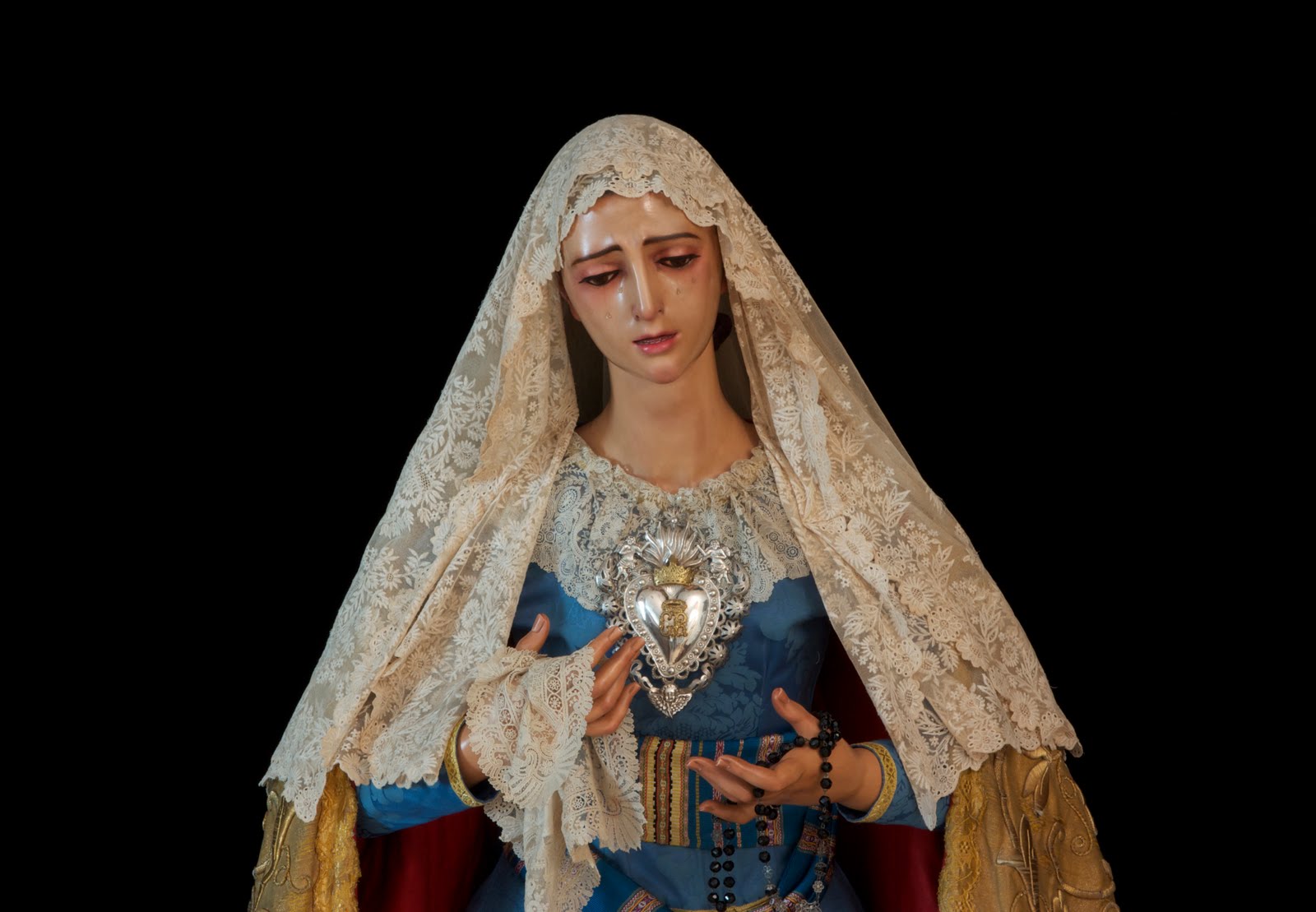 La Imagen de la Virgen de las Angustias es una obra de los años 90 del escultor sevillano Ángel Rengel. La actuación se ha centrado en la policromía , que es la segunda que dicho escultor aplicó a la obra y que nunca fue del agrado de la Hermandad y con razón, puesto que ahora se demuestra que desvirtuaba un modelado correcto y hermoso, que sin llegar a ser una copia fiel de la Virgen de las Angustias de Sevilla si la recuerda, aunque ahora la imagen haya adquirido entidad propia. Toda las actuaciones ,repito han sido a nivel pictórico, puesto que en ningún momento se ha intervenido el modelado. Mi condición de licenciado en restauración no me permite éticamente realizar ninguna reforma en los volúmenes.