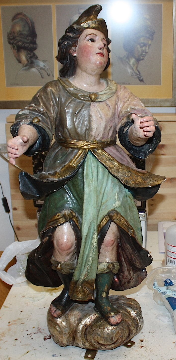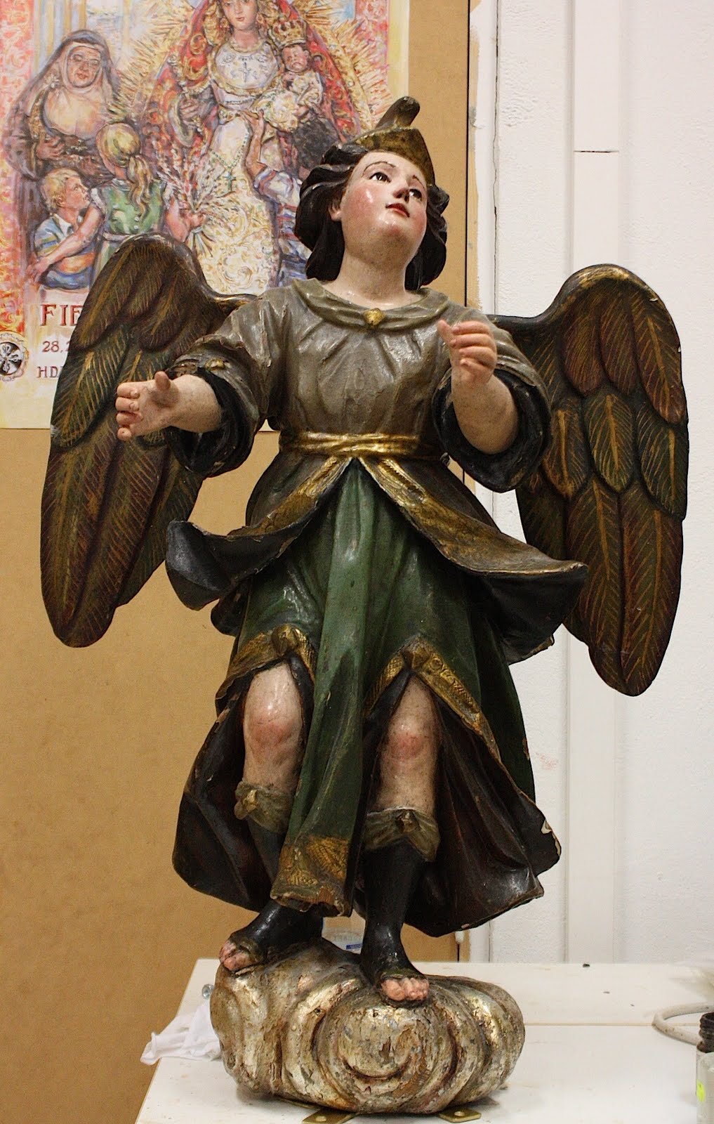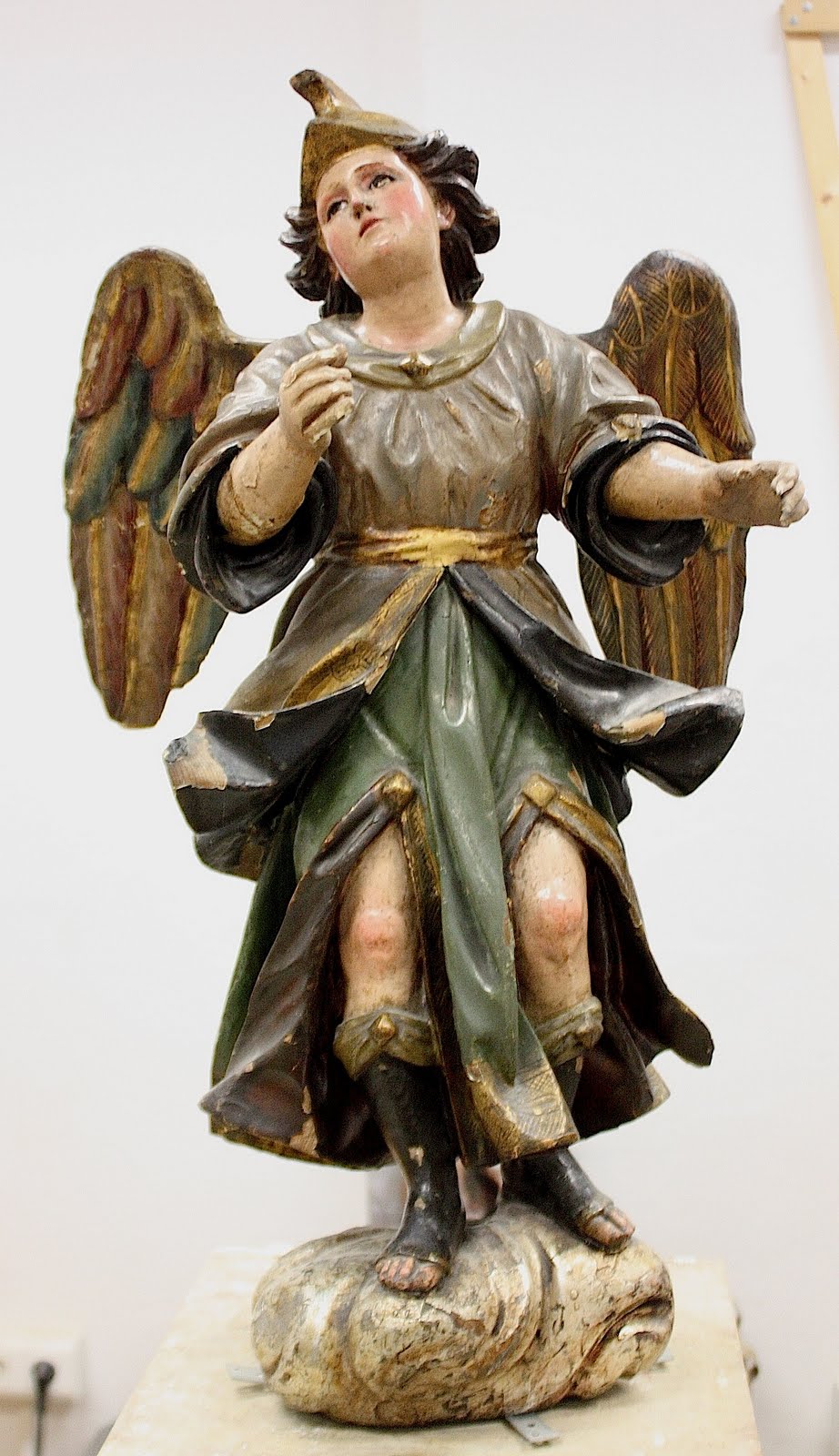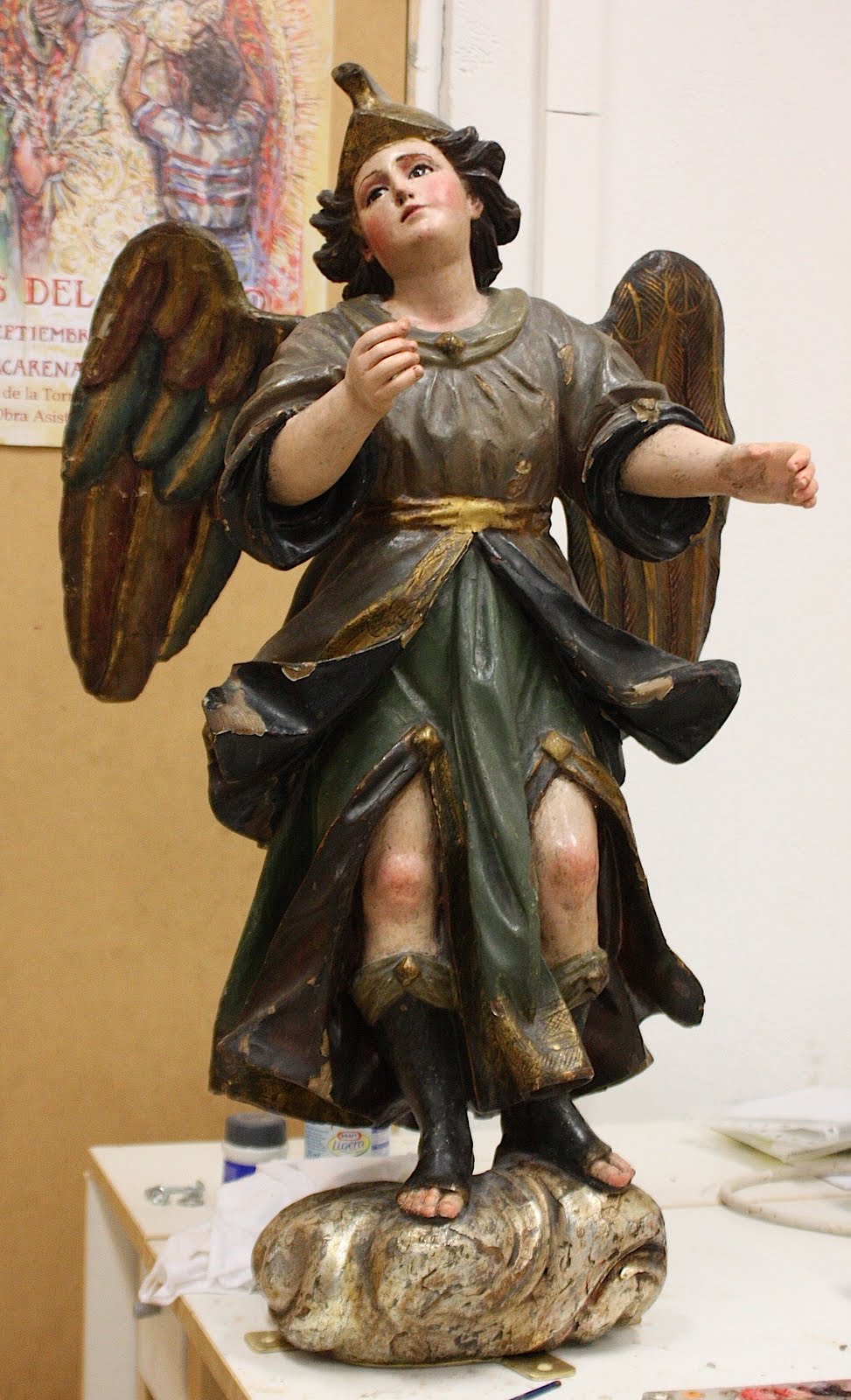 EN LA SEGUNDA FASE SE PROCEDIÓ A ACTUAR SOBRE LOS ROPAJES Y ALAS, QUE SE ENCONTRABAN MUY DETERIORADOS Y CON MULTIPLES REPINTES. SE DESCUBRIÓ QUE LOS CASCOS ERAN DE PLATLINO ESTOFADOS EN UN TONO GRIS QUE SE ENCONTRABA PRACTICAMENTE PERDIDO DEBAJO DE MULTIPLES CAPAS DE PURPURINA DORADA QUE LO OCULTABAN. DEL MISMO PLATINO CON ESTOFADO ROJIZO ERAN LOS FORROS DE LAS TELAS QUE TAMBIEN ESTABAN CASI PERDIDOS Y OCULTOS DEBAJO DE REPINTES DE LACAS AZULES . TANTO LOS CASCOS, COMO LAS NUBES Y FORROS HAN SIDO ESTOFADOS DE NUEVO SIGUIENDO LOS MÍNIMOS RESTOS QUE QUEDABAN DE LOS ORIGINALES. CON LA LIMPIEZA HA SALIDO A LA LUZ LOS COLORES ORIGINALES DE LAS ROPAS, DE TONOS PASTEL ROSACEO Y VERDE CLARO QUE HA SIDO CONVENIENTEMENTE REINTEGRADOS, SIN QUE LAS PIEZAS HAYAN PERDIDO SU SABOR AÑEJO.