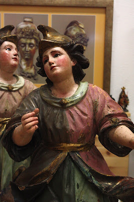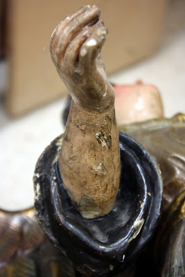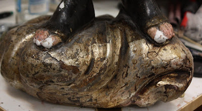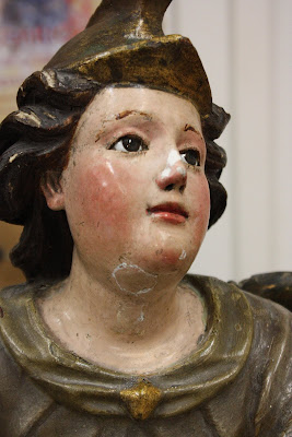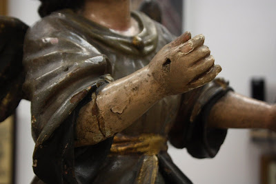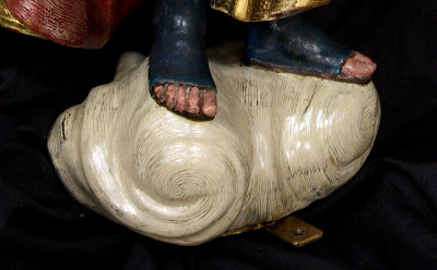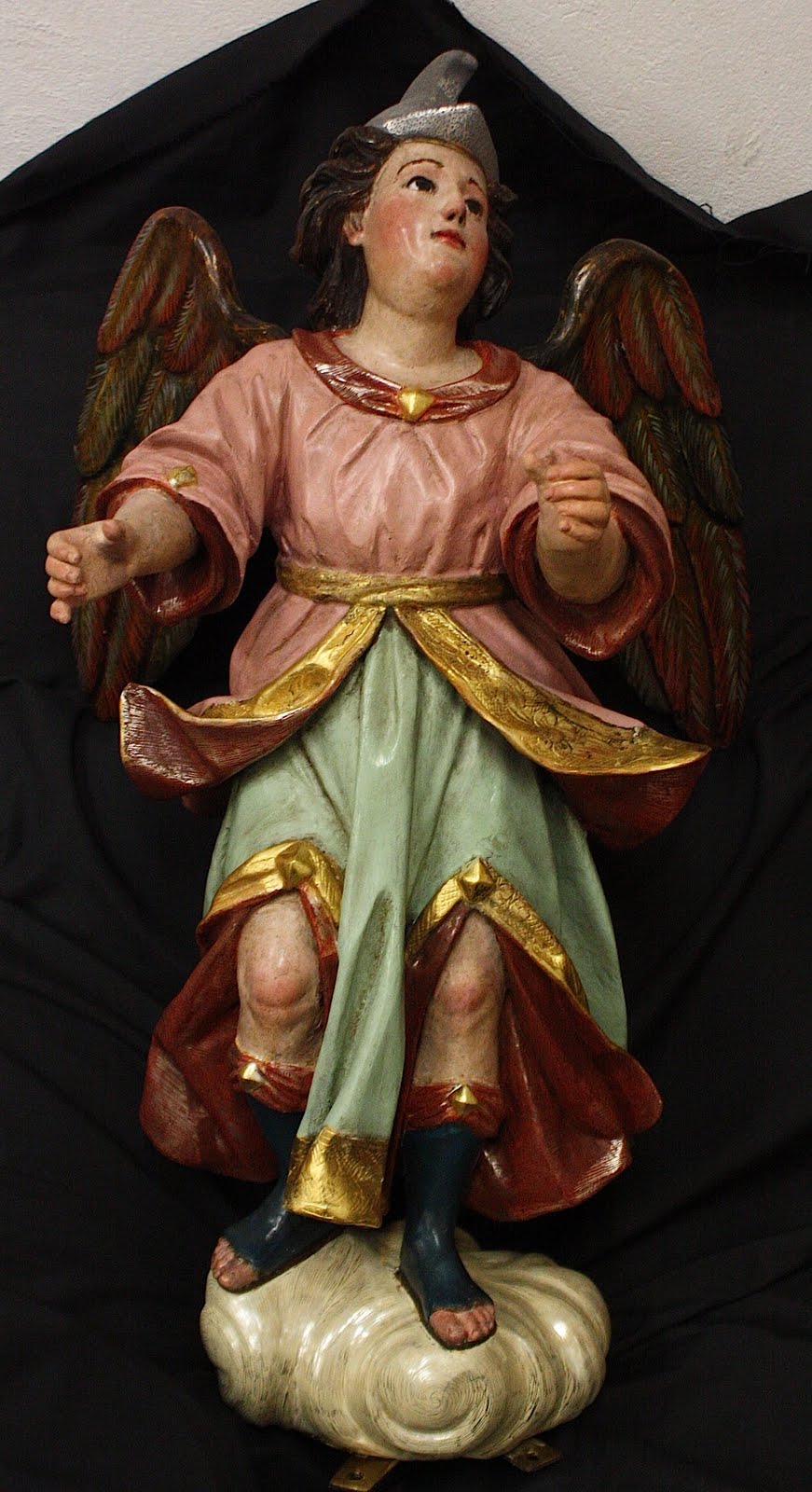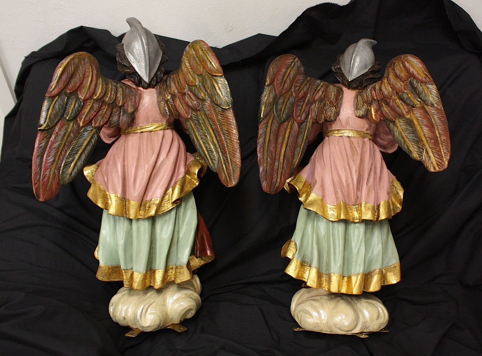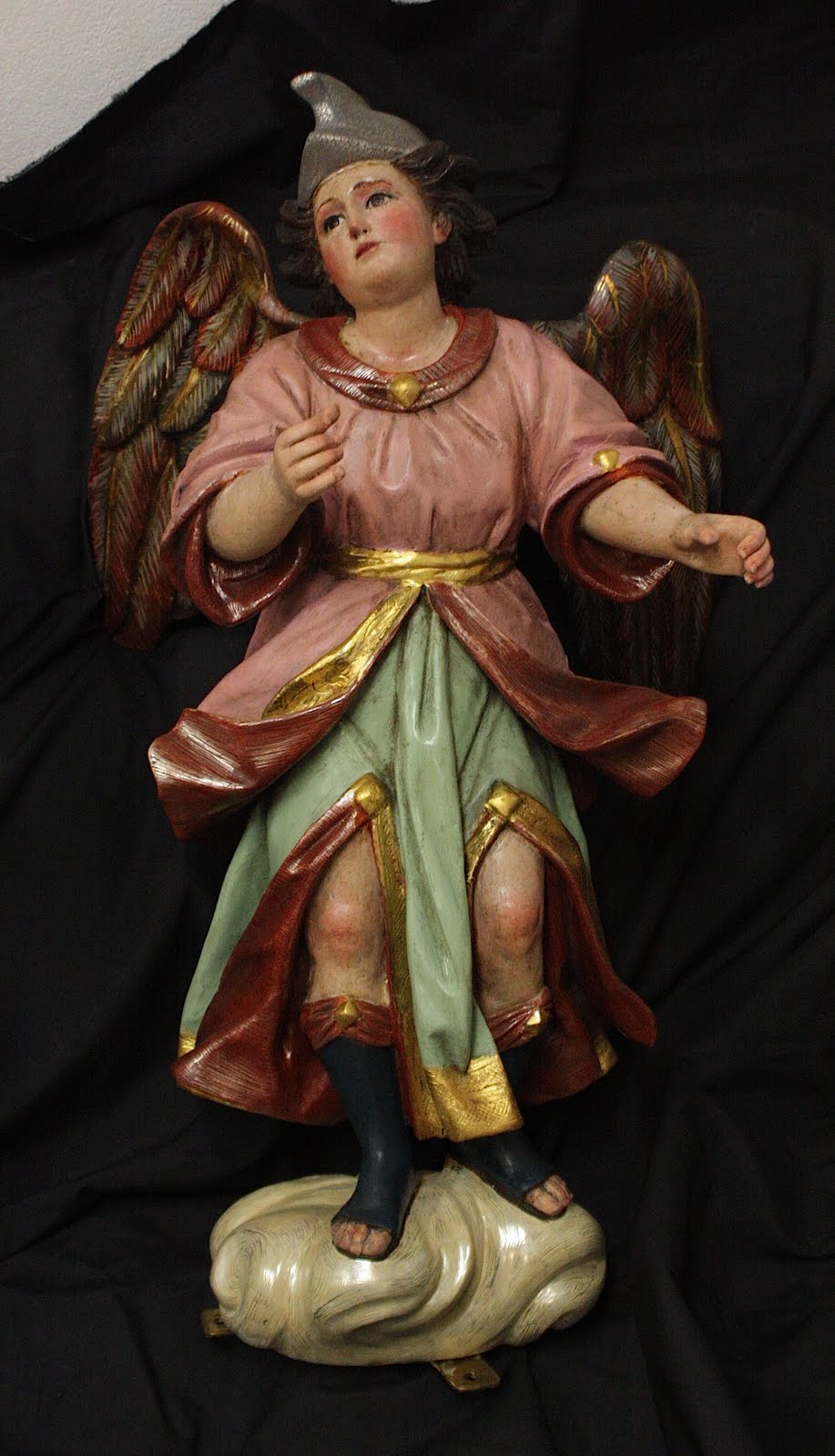EN LA SEGUNDA FASE SE PROCEDIÓ A ACTUAR SOBRE LOS ROPAJES Y ALAS, QUE SE ENCONTRABAN MUY DETERIORADOS Y CON MULTIPLES REPINTES. SE DESCUBRIÓ QUE LOS CASCOS ERAN DE PLATLINO ESTOFADOS EN UN TONO GRIS QUE SE ENCONTRABA PRACTICAMENTE PERDIDO DEBAJO DE MULTIPLES CAPAS DE PURPURINA DORADA QUE LO OCULTABAN. DEL MISMO PLATINO CON ESTOFADO ROJIZO ERAN LOS FORROS DE LAS TELAS QUE TAMBIEN ESTABAN CASI PERDIDOS Y OCULTOS DEBAJO DE REPINTES DE LACAS AZULES . TANTO LOS CASCOS, COMO LAS NUBES Y FORROS HAN SIDO ESTOFADOS DE NUEVO SIGUIENDO LOS MÍNIMOS RESTOS QUE QUEDABAN DE LOS ORIGINALES. CON LA LIMPIEZA HA SALIDO A LA LUZ LOS COLORES ORIGINALES DE LAS ROPAS, DE TONOS PASTEL ROSACEO Y VERDE CLARO QUE HA SIDO CONVENIENTEMENTE REINTEGRADOS, SIN QUE LAS PIEZAS HAYAN PERDIDO SU SABOR AÑEJO.