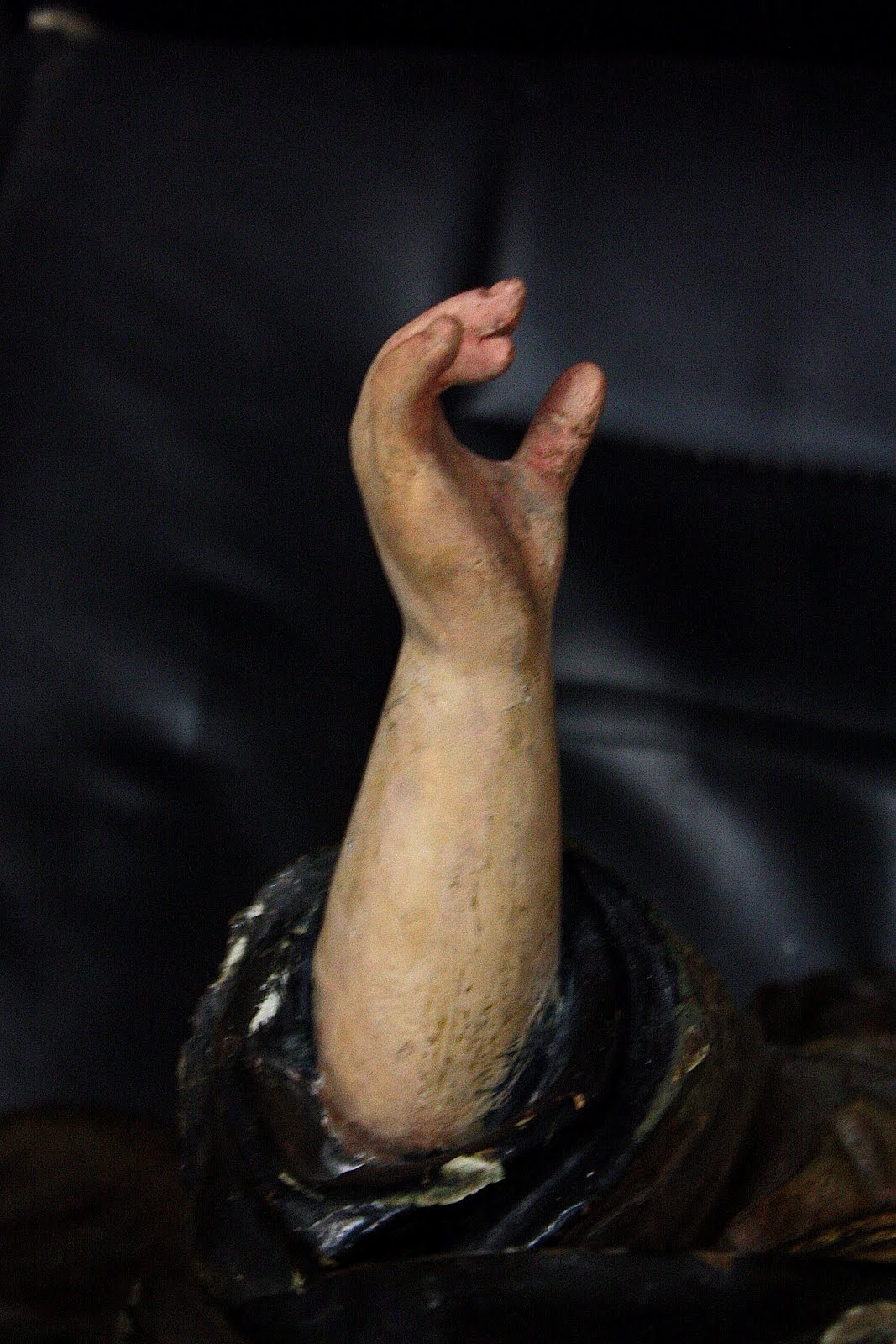 LA RESTAURACIÓN DE ESTAS PIEZAS HA SUPUESTO UN DURO PERO RECONFORTANTE TRABAJO REALIZADO EN DOS FASES. UNA PRIMERA EN LA QUE SE REALIZÓ UNA FIJACIÓN Y LIMPIEZA DE LAS POLICROMÍAS DE LAS CARNES ASÍ COMO LA RESTITUCIÓN DE DEDOS DE LAS MANOS QUE SE HABÍAN PERDIDO, SUSTITUYÉNDOSE TAMBIÉN EL SISTEMA DE FIJACIÓN DE LAS IMÁGENES A LA PEANA DE LA VIRGEN.