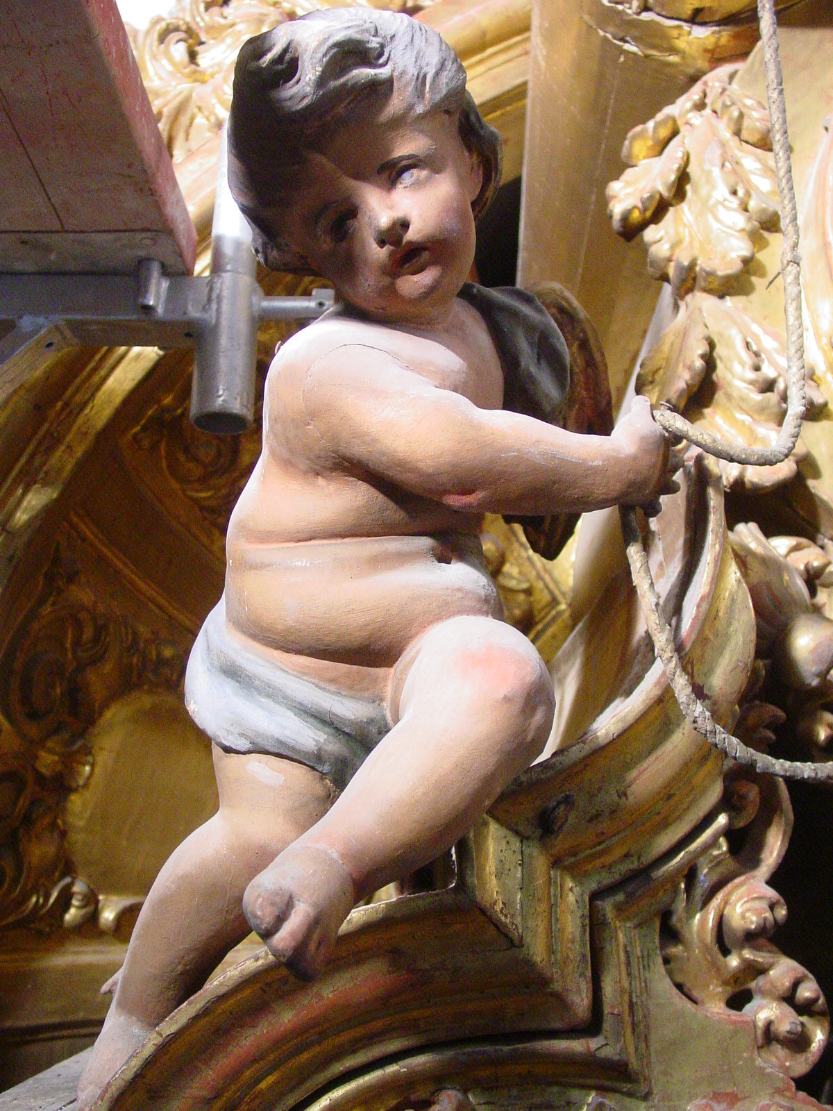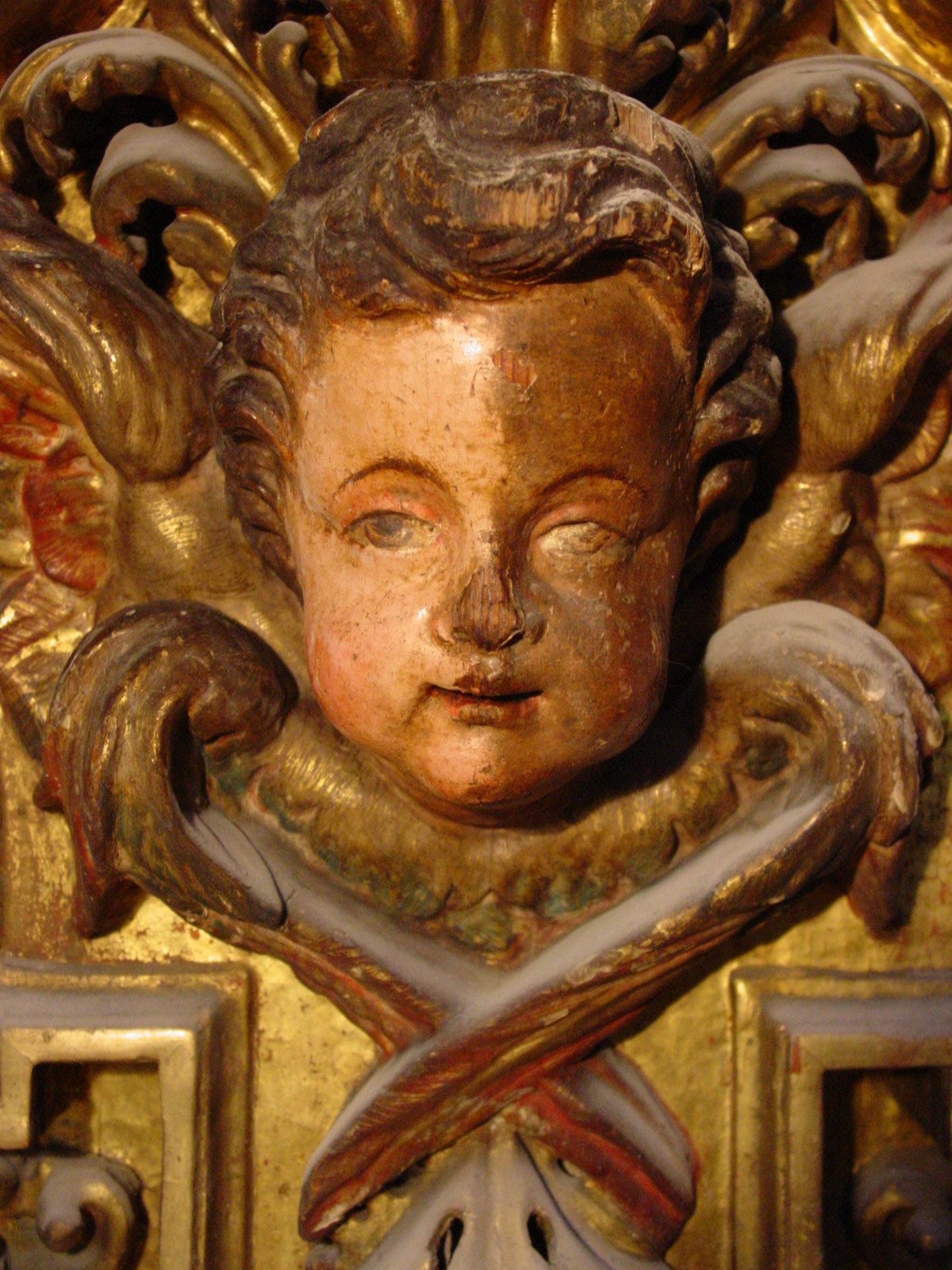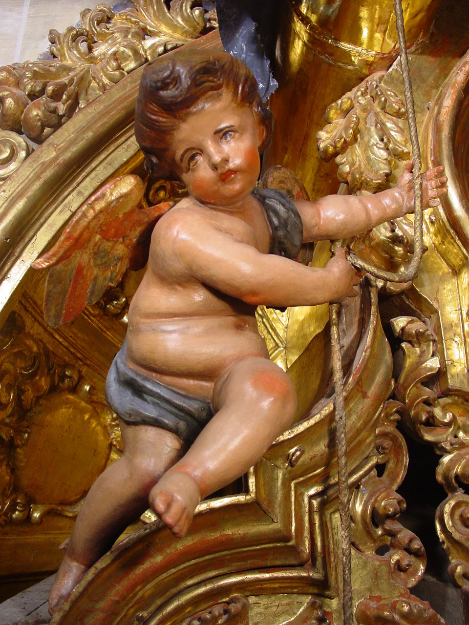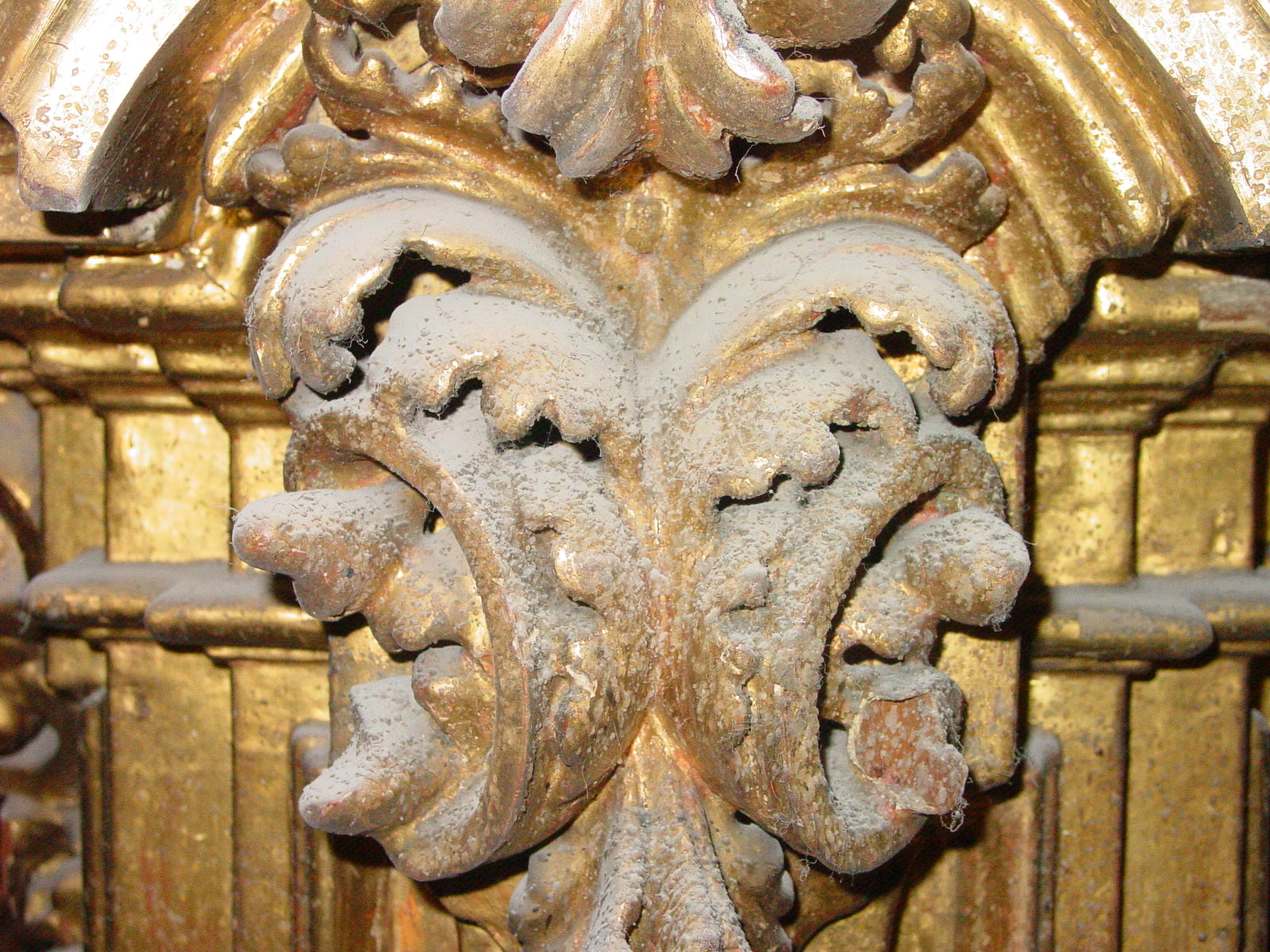 EL RETABLO PRESENTABA UN LAMENTABLE ESTADO DE CONSERVACIÓN, CON GRAN ACUMULACIÓN DE CERA Y SUCIEDAD SUPERFICIAL E INCRUSTADA, PIEZAS DESENSAMBLADAS, ORO REPINTADO CON CAPAS SUCESIVAS DE PURPURINA Y FALTA DE ADHESIÓN EN LOS ESTRATOS, ESTANDO LA IMAGINERÍA ALTERADA POR REPINTES, SIGNOS DE CARBONIZACIÓN Y PERDIDAS DE SOPORTE. SE PROCEDÍO TANTO EN LA TALLA COMO EN LAS ESCULTURAS A UNA LIMPIEZA MECÁNICA Y QUÍMICA, ENSAMBLAJE Y CONSOLIDACIÓN DE PIEZAS, RECUPERACIÓN DE SOPORTES PERDIDOS Y REINTEGRACIÓN CROMÁTICA DE POLICROMÍAS Y DEL ORO EN LAS PIEZAS REPUESTAS. EL CRITERIO ESTÉTICO ELEGIDO FUE PRESERVAR EL SABOR AÑEJO DEL RETABLO, RESPETANDO INCLUSO LOS DESGASTES DEL ORO QUE DEJABAN VER EL BOL ROJIZO ORIGINAL.