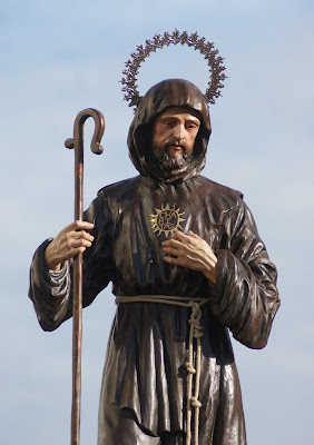La imagen tiene las mismsas dimensiones que la de San José, 151 cm más la altura de la peana que en este caso lleva escritos el nombre y fechas de nacimiento y muerte del Santo. Sigue la estética de ésta, ya que estarán juntos en el altar mayor y se pretende que no destaque más una que otra en cuanto a barroquismo. Por ello hace la simetría a San José llevando el báculo en la mano derecha y señalando el lema CHARITAS escrito en oro fino sobre el pecho con la mano izquierda.
