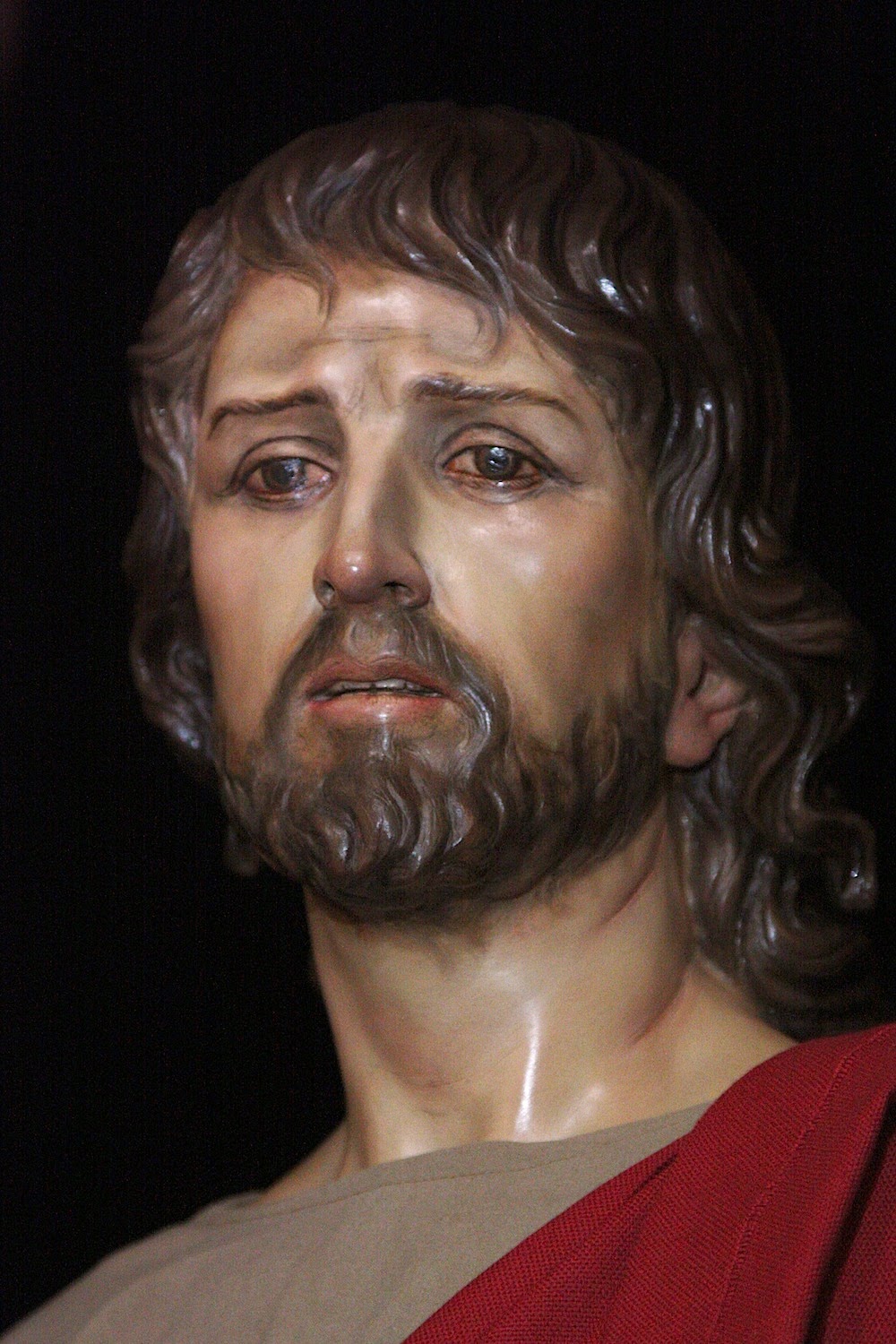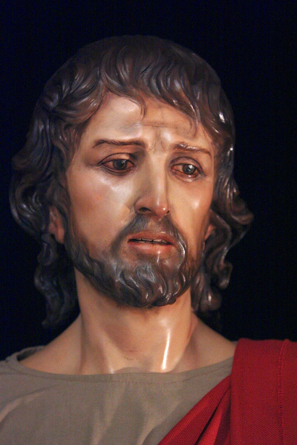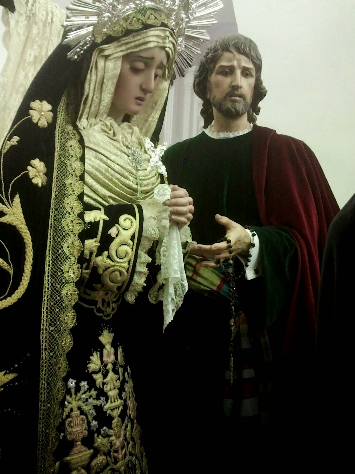 La imagen, realizada en madera de cedro policromada al óleo para ser vestida, continúa la línea estética del resto del conjunto. Una obra que responde al naturalismo de mi obra , sin buscar brusquedades  ni gestos ni posturas antinaturales o excesivamente idealizadas. De semblante triste y sereno plasma el momento en que conversa con José de Arimatea mientras con la mano derecha, sobre la espalda de la Virgen , la invita a iniciar la marcha hacia el Sepulcro.
