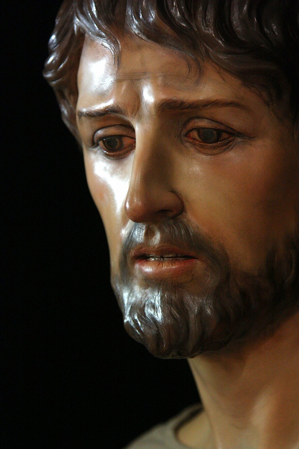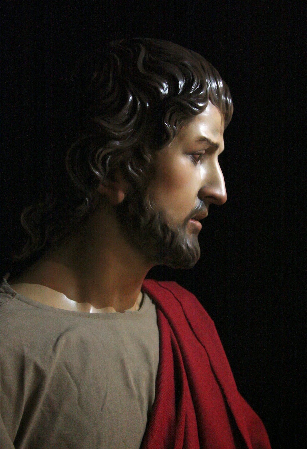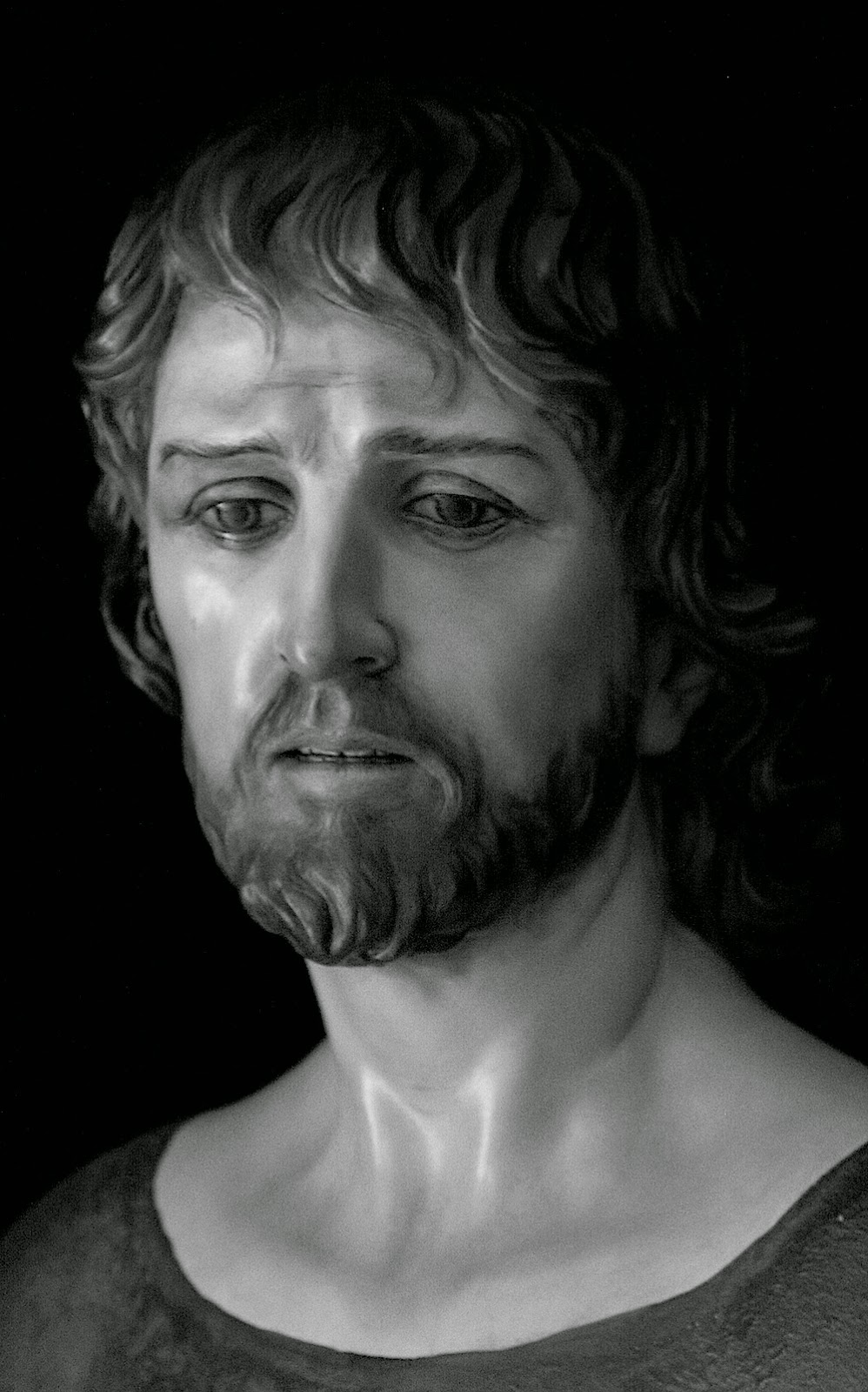 La imagen, realizada en madera de cedro policromada al óleo para ser vestida, continúa la línea estética del resto del conjunto. Una obra que responde al naturalismo de mi obra , sin buscar brusquedades  ni gestos ni posturas antinaturales o excesivamente idealizadas. De semblante triste y sereno plasma el momento en que conversa con José de Arimatea mientras con la mano derecha, sobre la espalda de la Virgen , la invita a iniciar la marcha hacia el Sepulcro.