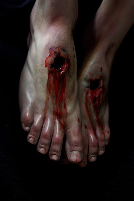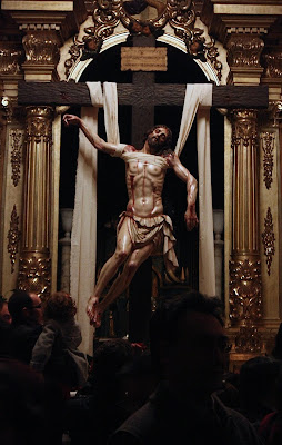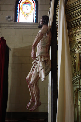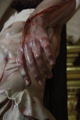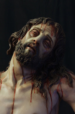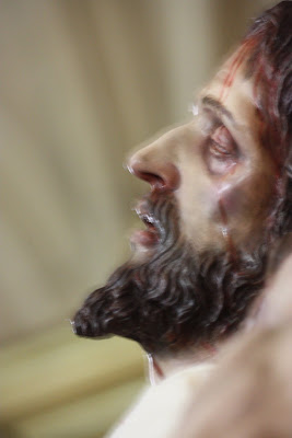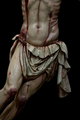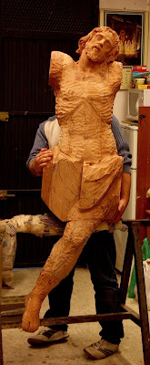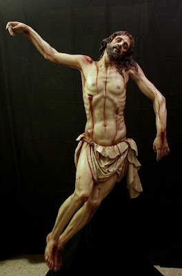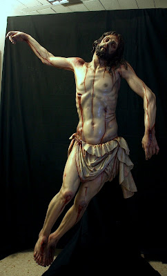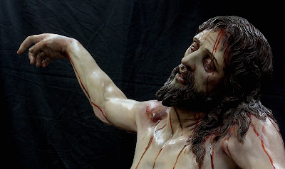 ESTA ES MI ÚLTIMA OBRA, LA IMAGEN DEL STMO CRISTO EN SU SAGRADO DESCENDIMIENTO, PRIMERA DE LAS QUE VAN A SER REALIZADAS PARA LA HERMANDAD DEL MISMO NOMBRE EN HELLÍN, ALBACETE, CUYA SEMANA SANTA ESTÁ DECLARA DE INTERÉS TURÍSTICO INTERNACIONAL. LA OBRA HA SIDO CONCEBIDA PARA PRESIDIR EL MISTERIO QUE ESTÁ REPRESENTADO EN LA MAQUETA. LA IMAGEN DE UN CRISTO CADAVÉRICO, RIGIDO DEVIDO A LA APARICIÓN DEL RIGOR MORTIS TRAS UNA MUERTE VIOLENTA EN LA CRUZ, AUNQUE DULCE EN SU ROSTRO, DESCANSANDO SU CABEZA SOBRE EL HOMBRO IZQUIERDO. LA BOCA ESTÁ ENTREABIERTA Y LOS LABIOS AMORATADOS SIN VIDA, LOS OJOS HUNDIDOS Y LA PIEL PÁLIDA Y DESANGRADA. EL SUDARIO Y EL BRAZO IZQUIERDO CAEN LA LÍNEA DE GRAVEDAD PARALELOS A LA CRUZ TANTO DE FRENTE COMO DE PERFIL. LA ÁXILA IZQUIERDA ESTÁ PRESIONADA POR LA SÁBANA, SUBIENDO LA CARNE POR EL PESO EL CUERPO CONSIGUIENDO DAR LA SENSACIÓN DE ESTAR SUSPENDIDO DE LA MISMA.LA CINTURA EN CONTRAPOSTO, PLIEGA LA PIEL EN SU LADO IZQUIERDO.