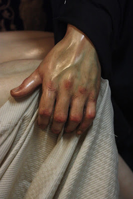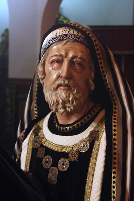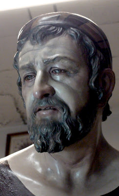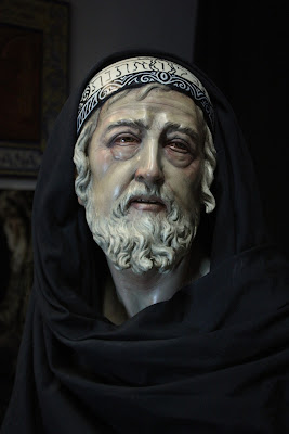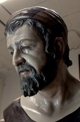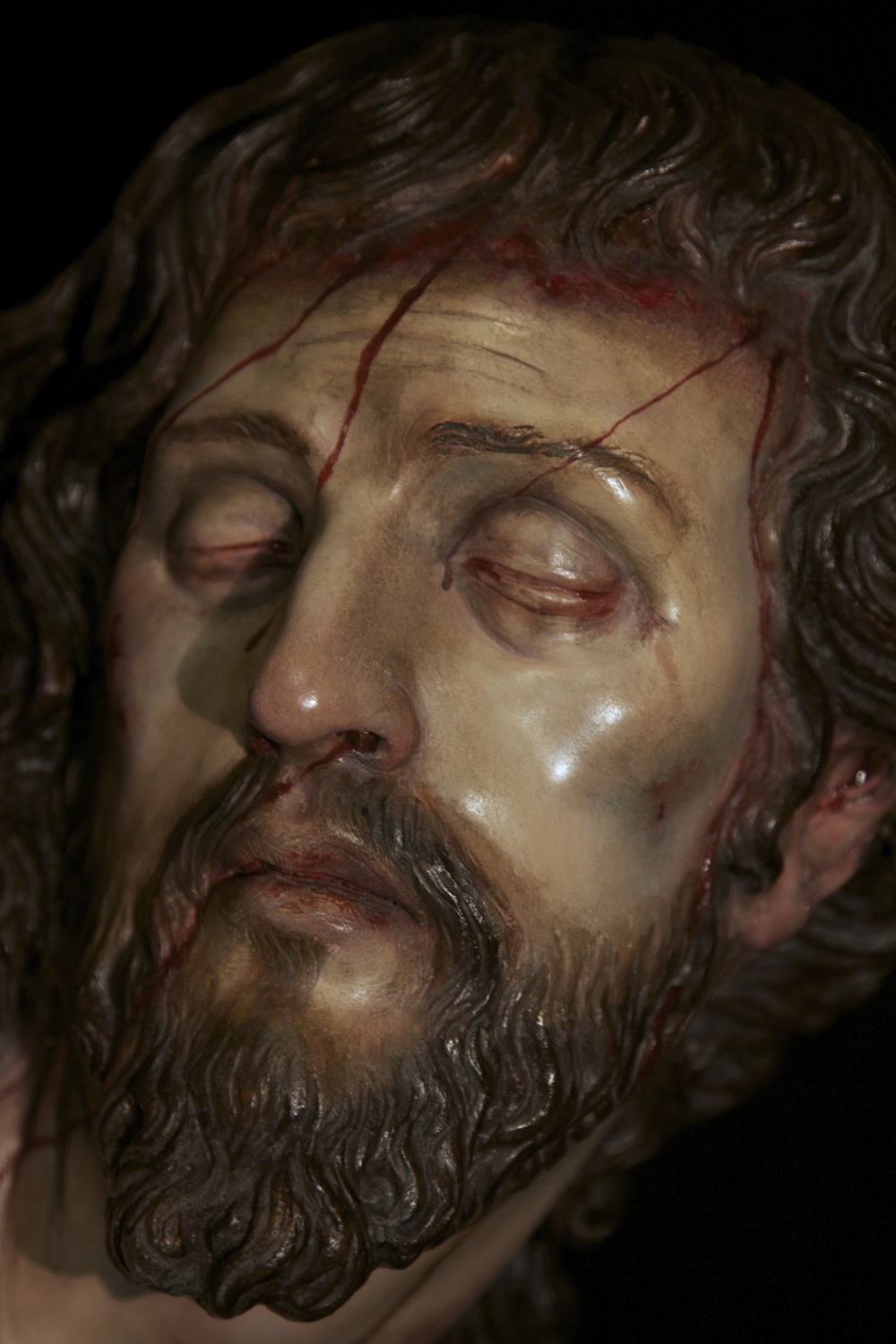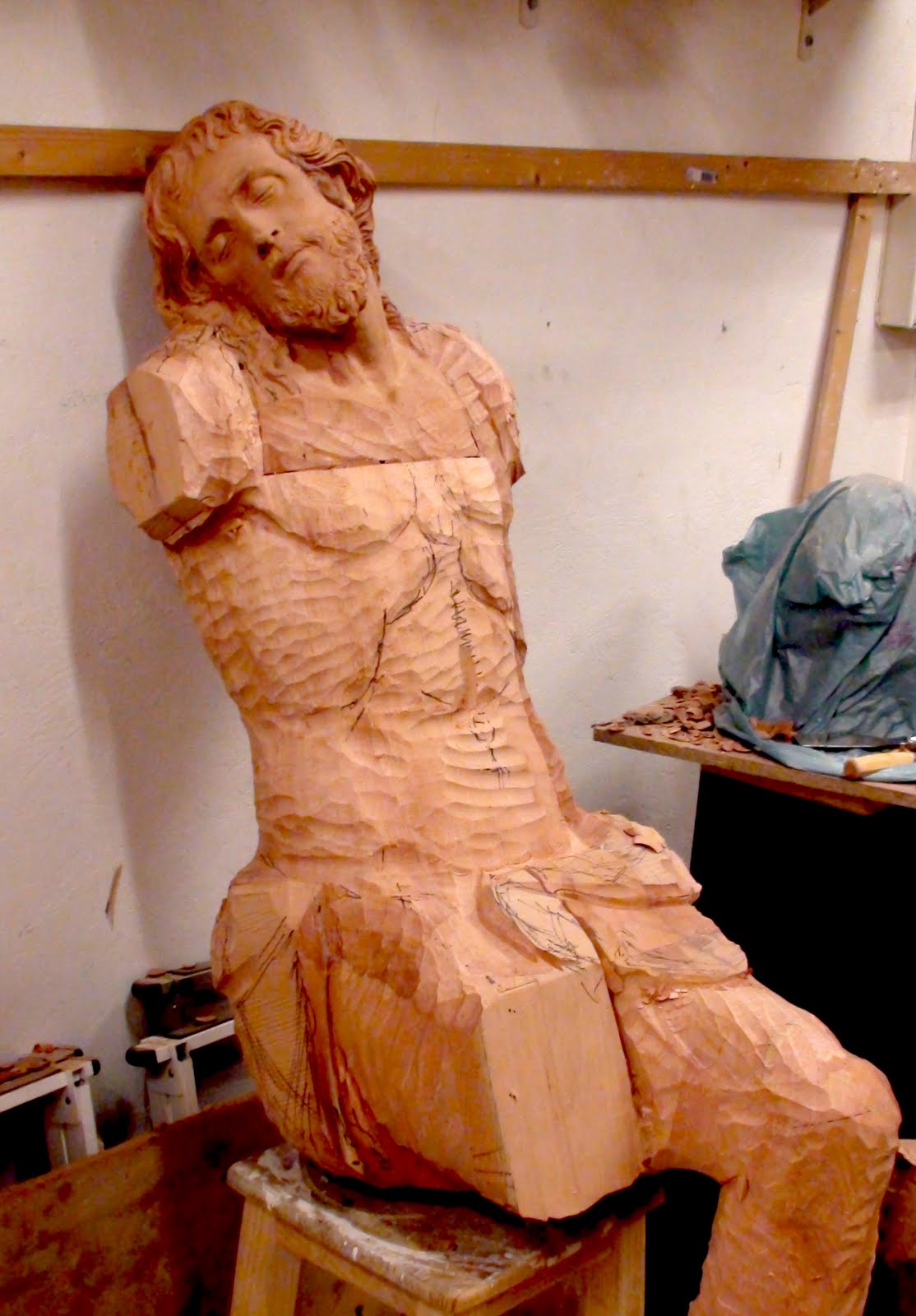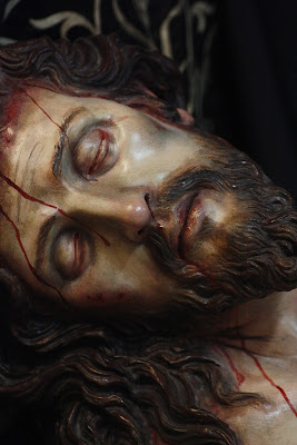 Ellos, como Santos Varones, y miembros del sanedrín(así aparecen vestidos), portan a Jesús en la que se supones sería la Síndone(Santo Sudario venerado en Turín). De esta manera además de a Julio, he querido homenajear especialmente a mi maestro Miñarro al que tanto debo. No son retratos exactos puesto que no ha sido tal la intención al ser la Virgen de la Piedad una imagen muy clásica , pero si están basados en sus expresiones. La composición va de lado a lado del paso, en el momento en que está lavantando el cuerpo sin vida, blanquecino y grisáceo de Cristo para llevarlo al Sepulcro ante el dolor de la Virgen. José de Arimatea vuelve la cabeza hablando con San Juan(imagen aún por realizar)mientras Nicodemo contempla con tristeza y ternura el rostro muerto del Señor. La imagen de Cristo, cuyo cuerpo ha sido tallado en directo, deja caer el brazo izquierdo, mientras el derecho está aún sobre la cadera a punto de desprenderse. El rostro es sereno, lleno de paz. El sudario recogido con soga tallada,con los pliegues cayendo en el sentido de la gravedad . La policromía es cadavérica, con poca sangre , ya que el cuerpo se supone que ha sido limpiado, aunque algunas heridas vuelven a manar, como así se aprecia en la Síndone, sindo muy significativa la del costado. Las perforaciones de los clavos de los miembros superiores está en las muñecas. El cuerpo, manos y pies aparecen amoratados por la magulladuras, golpes y falta de riego sanguíneo.