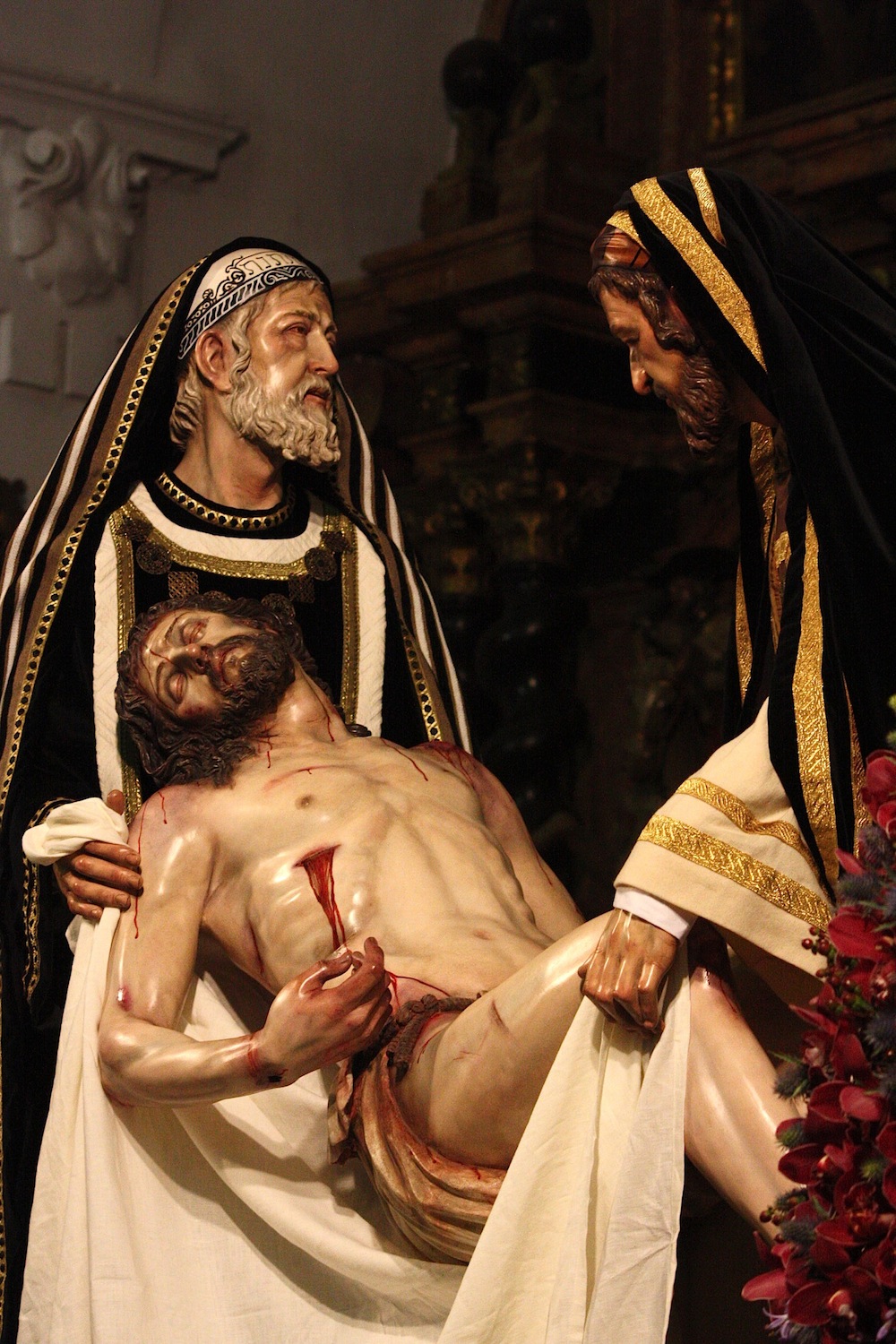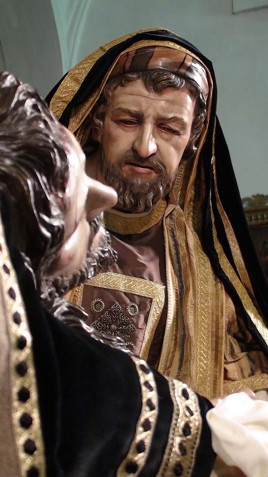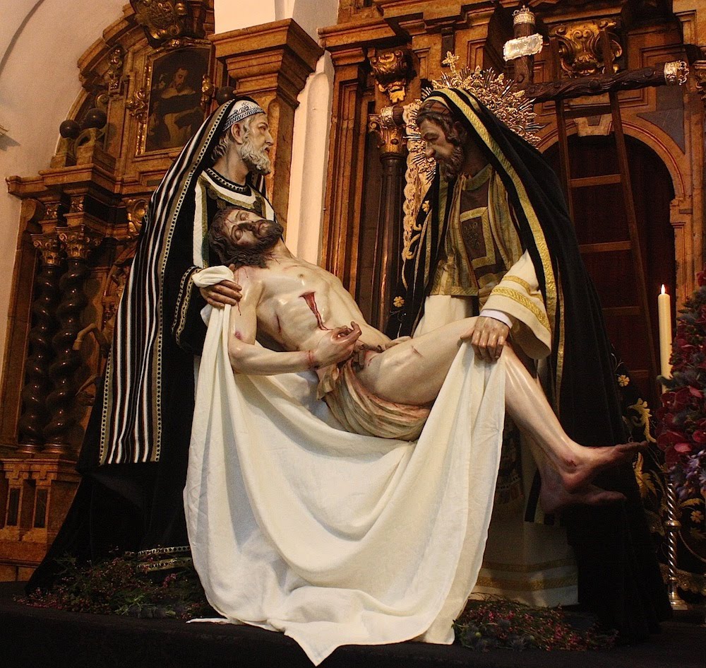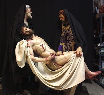 Este es el conjunto escultorico del Stmo Cristo del Amor en su Traslado al Sepulcro para la localidad de Cabra, en brazos de José de Arimatea y Nicodemo, para cuyas imágenes han servido de modelos D.Julio Marvizón y D. Juan Manuel Miñarro, ambos investigadores sevillanos de la Sábana Santa .