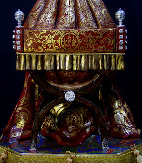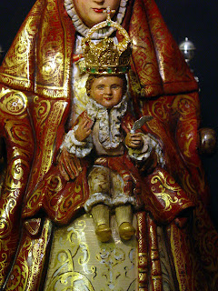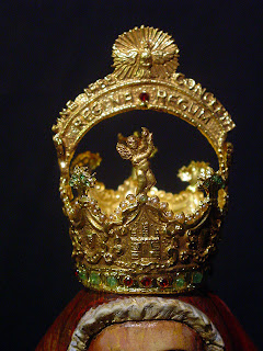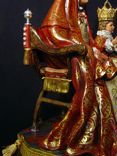 ESTA ES UNA REPRODUCCIÓN DE LA PATRONA DE LA ARCHIDIÓCESIS DE SEVILLA REALIZADA EN BARRO COCIDO, DORADO EN ORO FINO Y ESTOFADO AL TEMPLE. SE HA REPRODUCIDO LA POLICROMÍA ON LAS LAGUNAS EN ROSTRO Y MANOS, LA IMITACIÓN DEL CAREY DE LA SILLA Y HASTA LA MEDALLA Y LLAVE DE LA CIUDAD EN EL PECHERÍN. TAMBIEN SE HA DIBUJADO EN LA COLA DEL MANTO EL ESCUDO DEL CARDENAL.LA OBRA, DE UNOS 40 CM DE ALTURA SE COMPLETA CON ORFEBRERÍA EN PLATA DE LEY DORADA Y CON PEDRERÍA NATURAL OBRA DE MANUEL JIMENEZ ALMAGRO.LA OBRA HA SIDO DONADA POR EL CONSEJO SUPERIOR DE HERMANDADES Y COFRADÍAS DE SEVILLA A CARDENAL DE SEVILLA FRAY CARLOS AMIGO VALLEJO CON MOTIVO DE SUS VEINTICINCO AÑOS DE SU LLEGADA A LA SEDE HISPALENSE. SEGÚN HA MANIFESTADO EL SEÑOR CARDENAL, CUYA IMAGEN BENDIJO EL MIO DÍA 4 DE NOVIEMBRE , LA IMAGEN LE ACOMPAÑARÁ EN LAS AUDIENCIAS MÁS RELEVANTES Y EN ACTOS QUE SE CELEBREN EN EL PALACIO ARZOBISPAL.MIENTRAS TANTO SE CONSERVARÁ